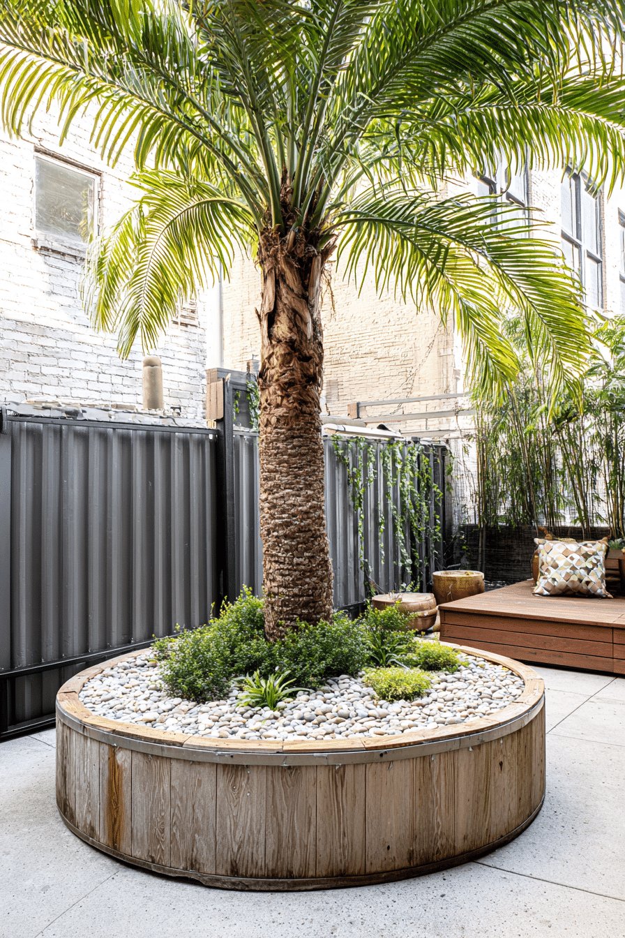 I love the sculptural simplicity of the round wooden planter cradling that palm. The warm wood offsets the concrete, the river rocks keep the base tidy, and the low evergreen shrubs and spiky rosettes add just enough texture to feel intentional without fuss. It reads like an urban oasis that knows how to be calm and a little bit confident.