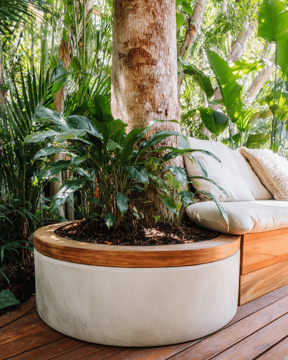 I love the way a smooth, round concrete planter with a teak rim makes the tree feel intentional instead of in the way. The bed around the trunk is planted with glossy, shade-loving foliage that reads lush without being fussy, topped with dark mulch for contrast.