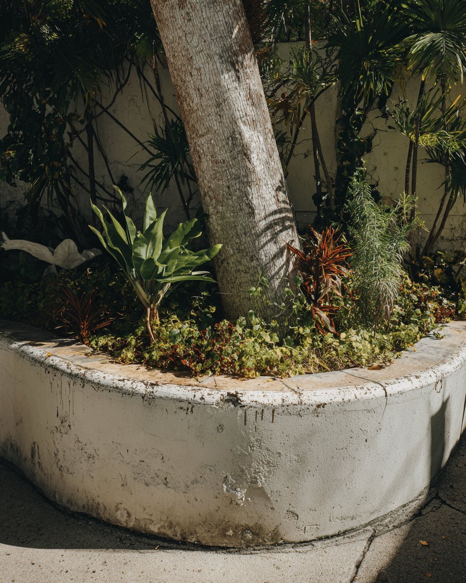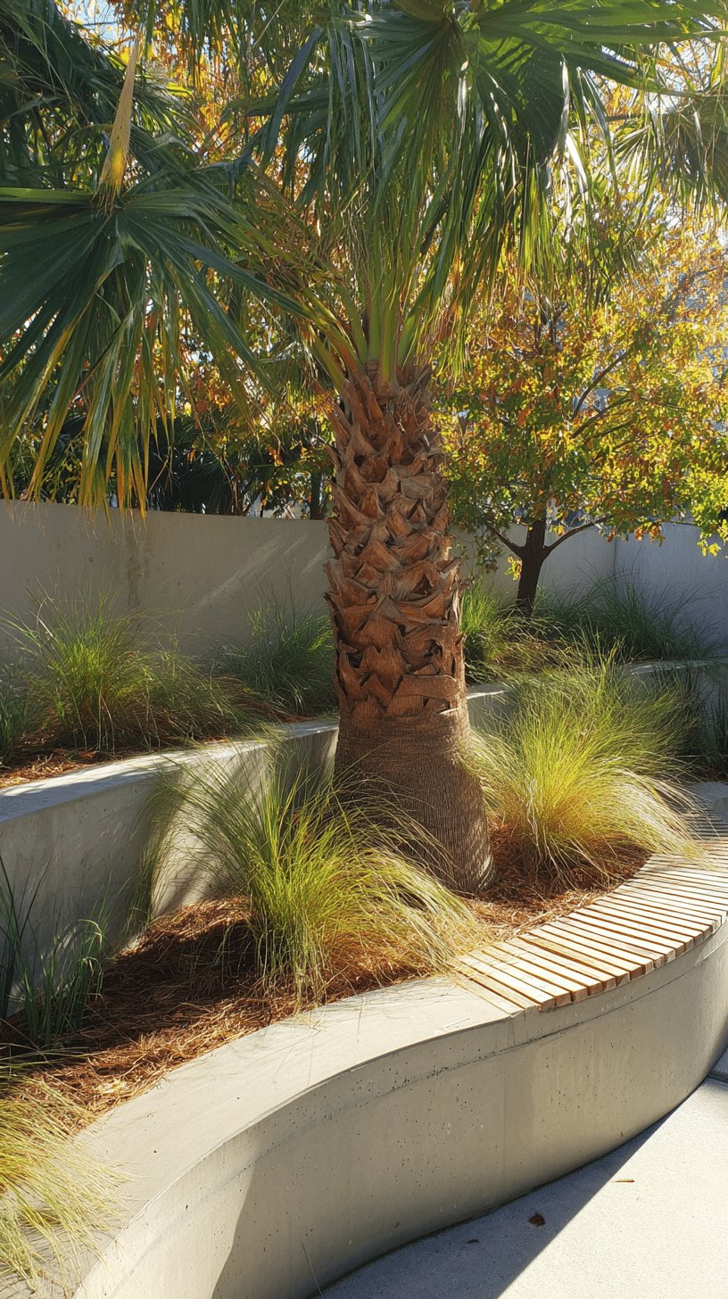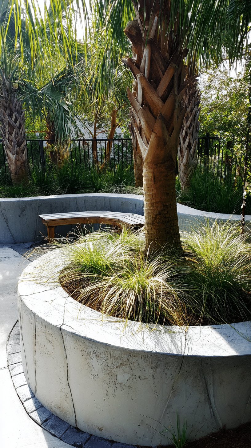 I love how the curving concrete planter wraps around the palm like it was always meant to be there. The rough, sculptural trunk and the soft, fountain-like grasses create a lovely contrast that feels both deliberate and relaxed.