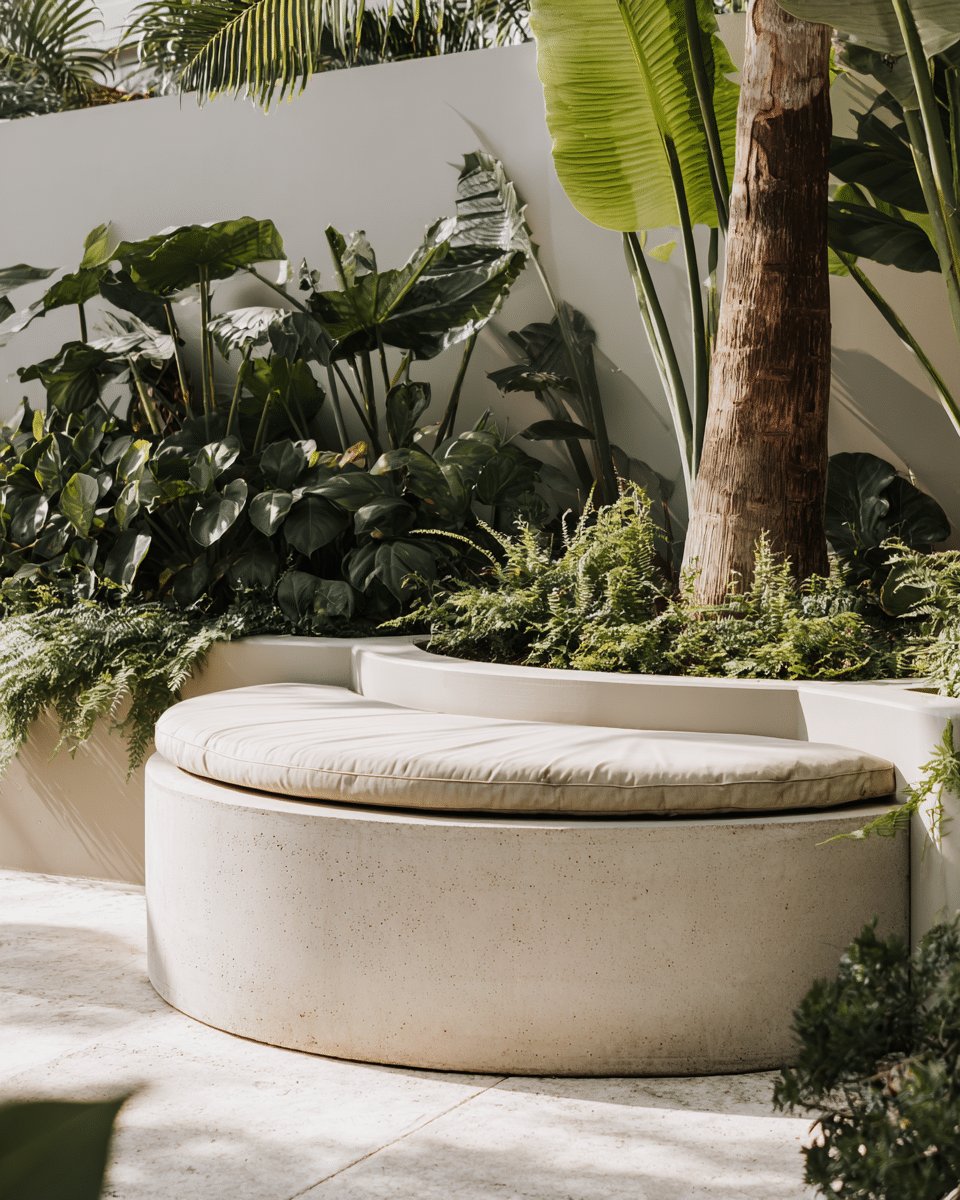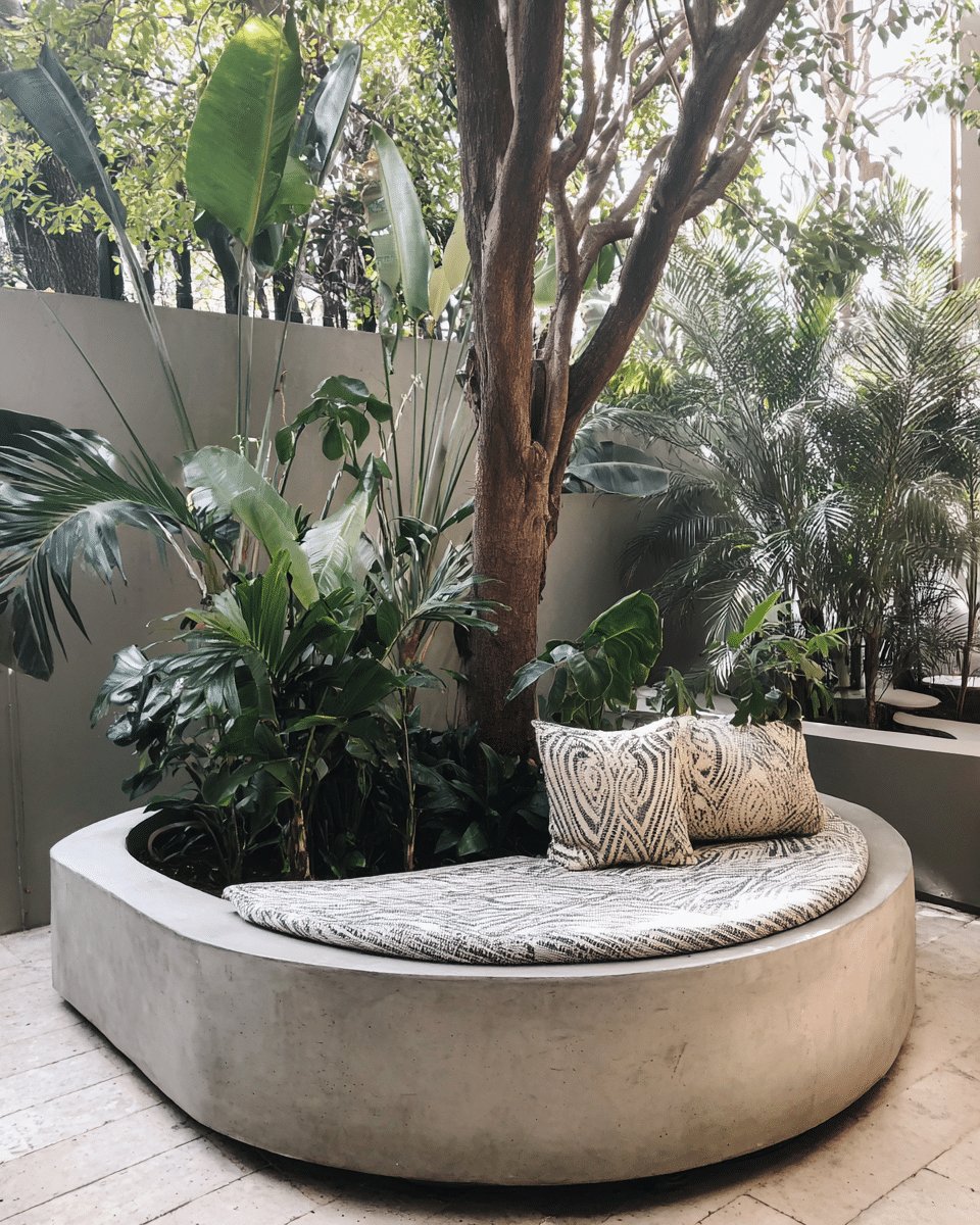 I love how the circular planter doubles as seating and a sculptural focal. The smooth concrete ring with a plush round cushion feels calm but not precious, and the tree trunk rising from the center gives the whole thing instant privacy and shade.