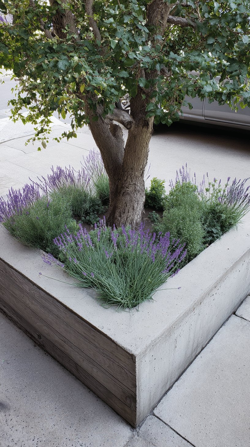 The trunk anchors the composition and the low planting hides the root flare, adds scent, and pulls pollinators in, so it feels like a tiny ecosystems stage for bees and sunlit afternoons.