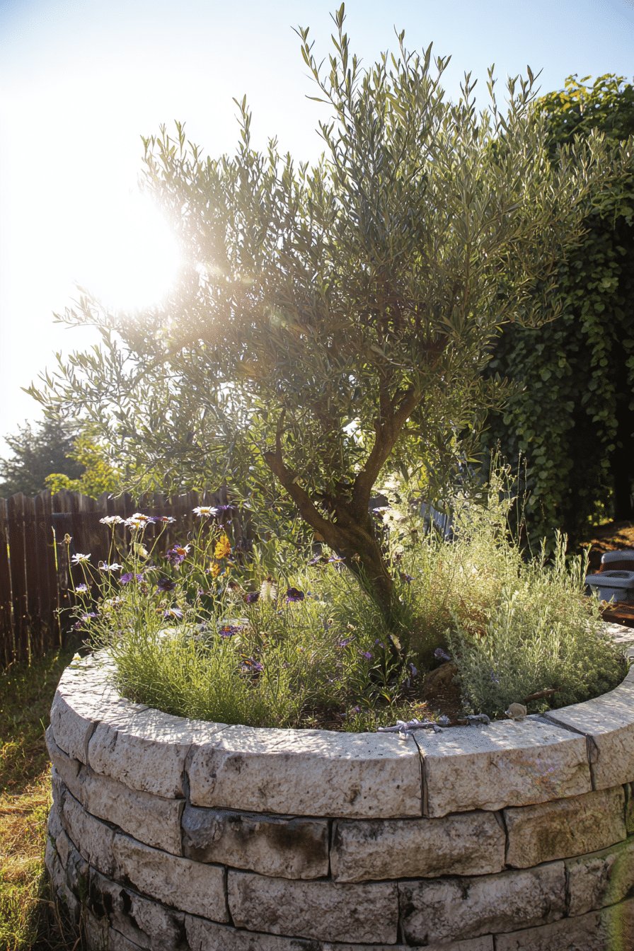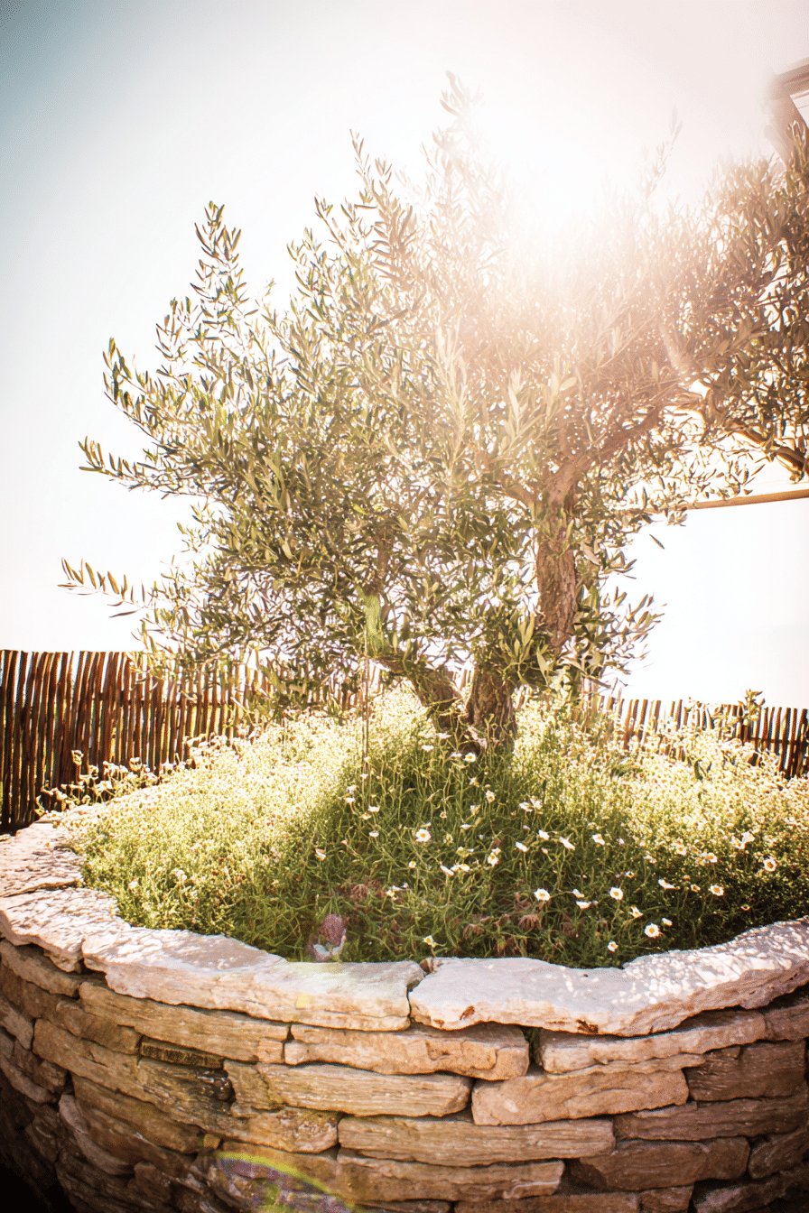 I love the relaxed, sun-soaked vibe of this raised stone planter wrapping a knotty olive tree. The low circular wall of stacked limestone doubles as casual seating and makes the whole thing feel like a tiny island of meadow.