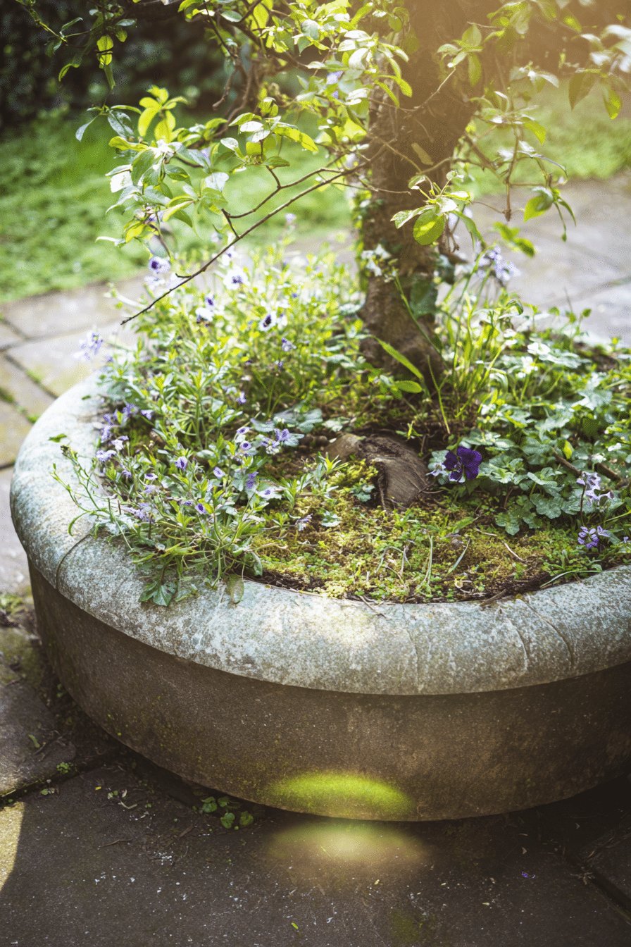 The weathered rim and patina give it instant charm, while the little carpet of moss, tiny purple violas and creeping groundcover keeps the base soft and low-commitment. The tree trunk gives height and dappled shade, so everything feels layered without trying too hard.