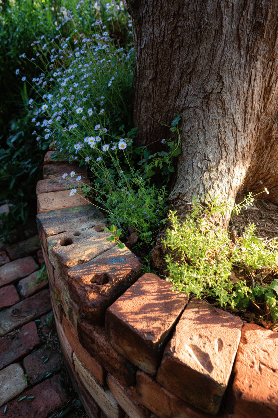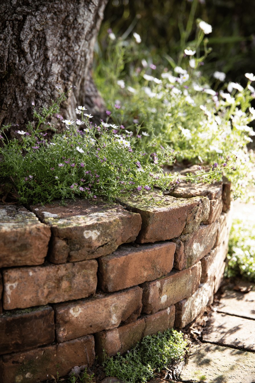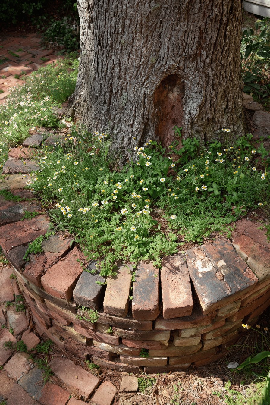 I love the cozy, cobbled-together charm of these planters around the tree. Reclaimed bricks stacked into a slightly wonky ring give instant character, while tiny white daisy-like blooms and a carpet of low, thyme-like groundcover spill over the edges and soften the hard lines.