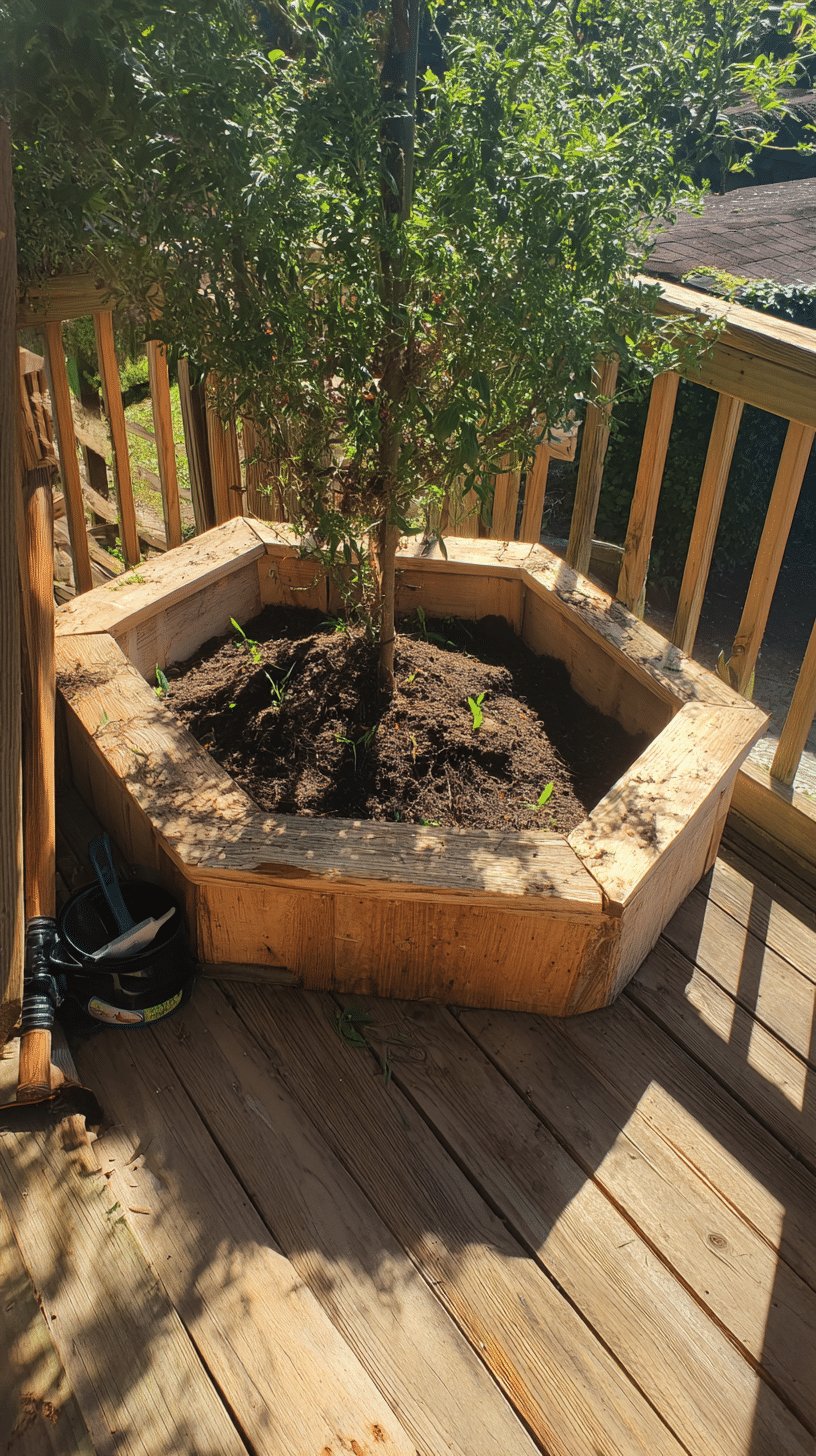 I love the snug, hexagonal planter that wraps the tree like a wooden hug. The bench-like rim reads as extra seating and a handy spot for a cup of coffee, while the rich, dark soil and those tiny green shoots promise something fuss-free and lively in a few weeks.