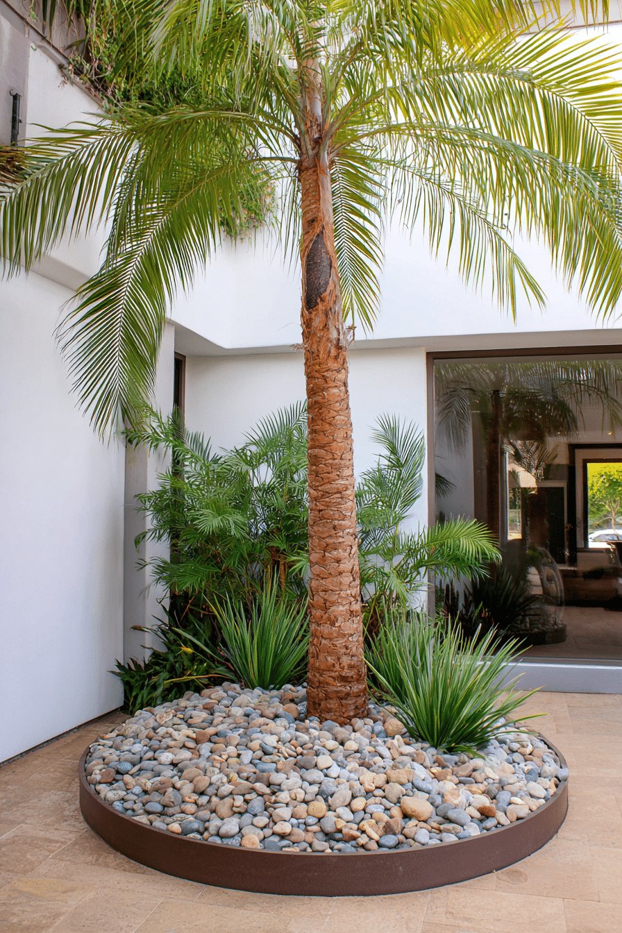 I love how this low, circular planter makes the palm feel curated instead of just planted. The warm metal rim frames the trunk like jewelry, while the smooth river rocks keep the base clean and modern.