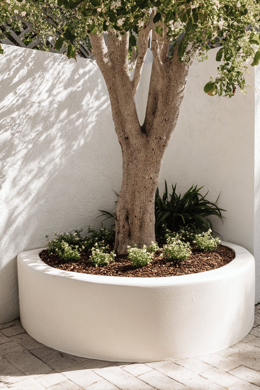I love how the rounded white planter turns the tree into a little focal moment. The smooth, plaster-like rim feels modern but relaxed, and the ring of bark mulch plus those low, white-flowering groundcovers makes the base look tidy without trying too hard.