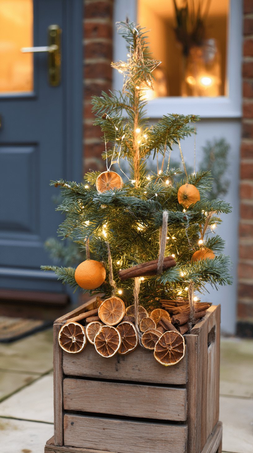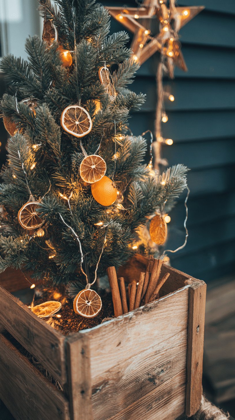 Dried orange slices on a simple string, cinnamon sticks tucked into the soil, and warm fairy lights give it that nostalgic, wintry smell even without a fireplace. The little star light in the background finishes the scene with soft glow and a bit of rustic charm.
