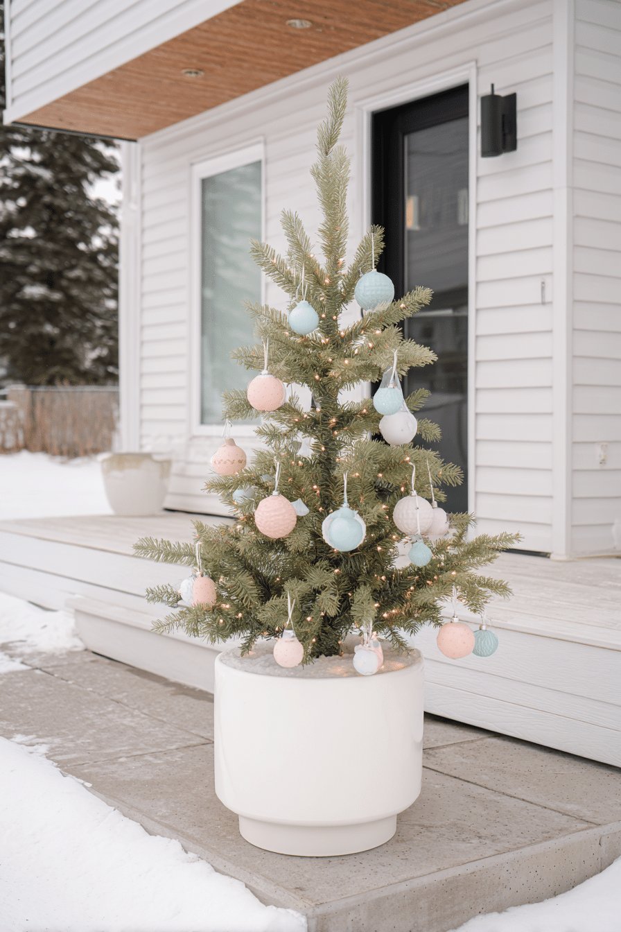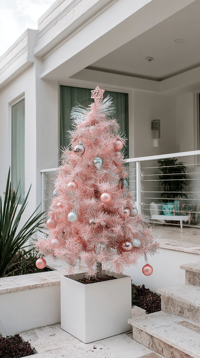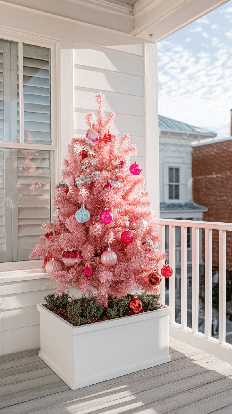I love the bubblegum-pink tree tucked into that crisp white rectangular planter. It feels like candy and class at once: oversized glass baubles in hot pink, blush, aqua and confetti dangle from every branch, and a neat ring of low evergreens at the base makes the whole thing feel finished and porch-ready.
