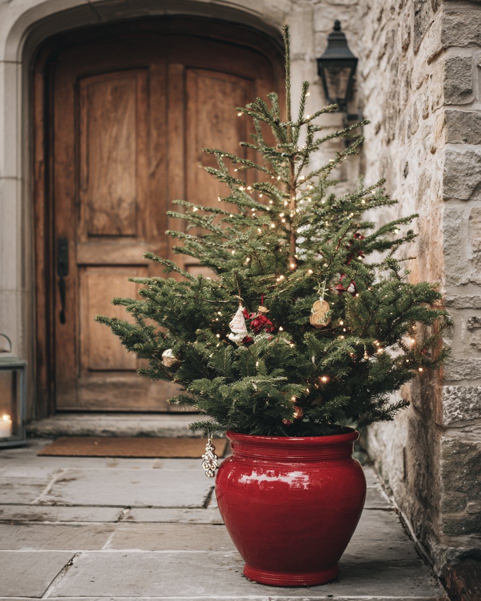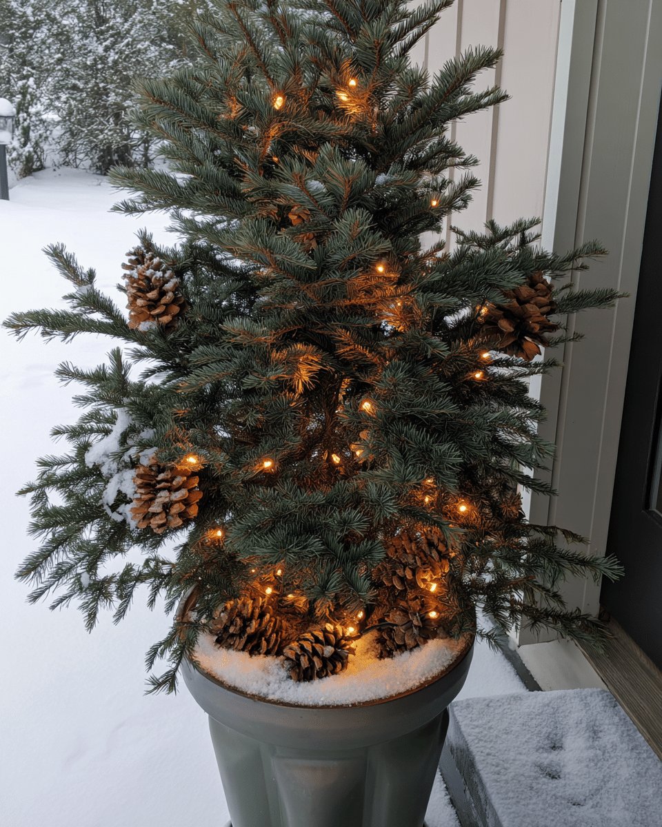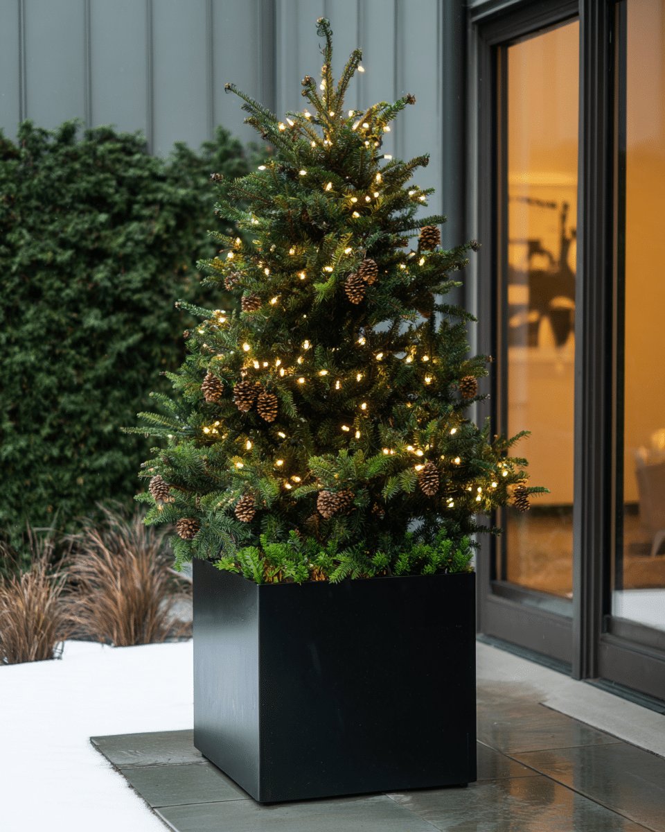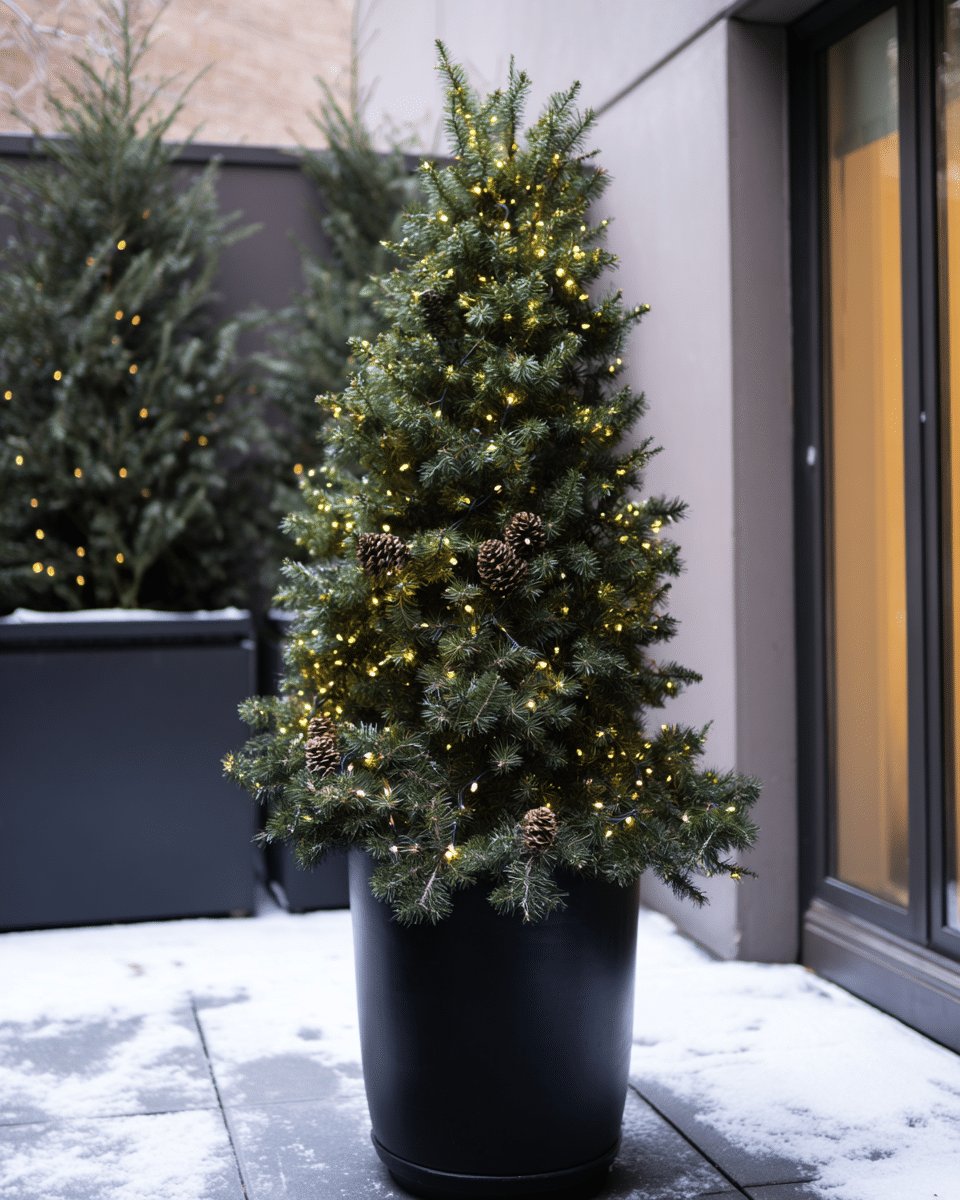 For small spaces, cluster two or three mini evergreens at different heights and tuck a string of lights through each for instant cozy curb appeal.