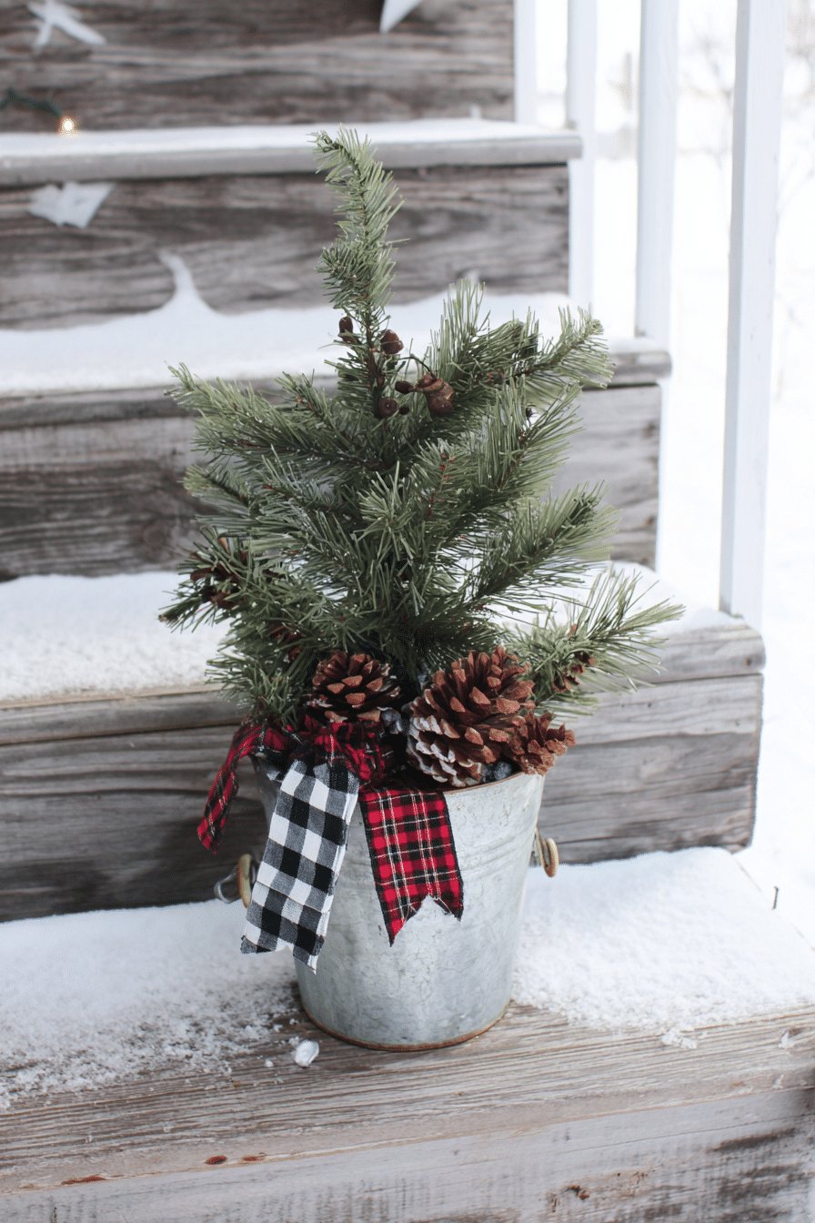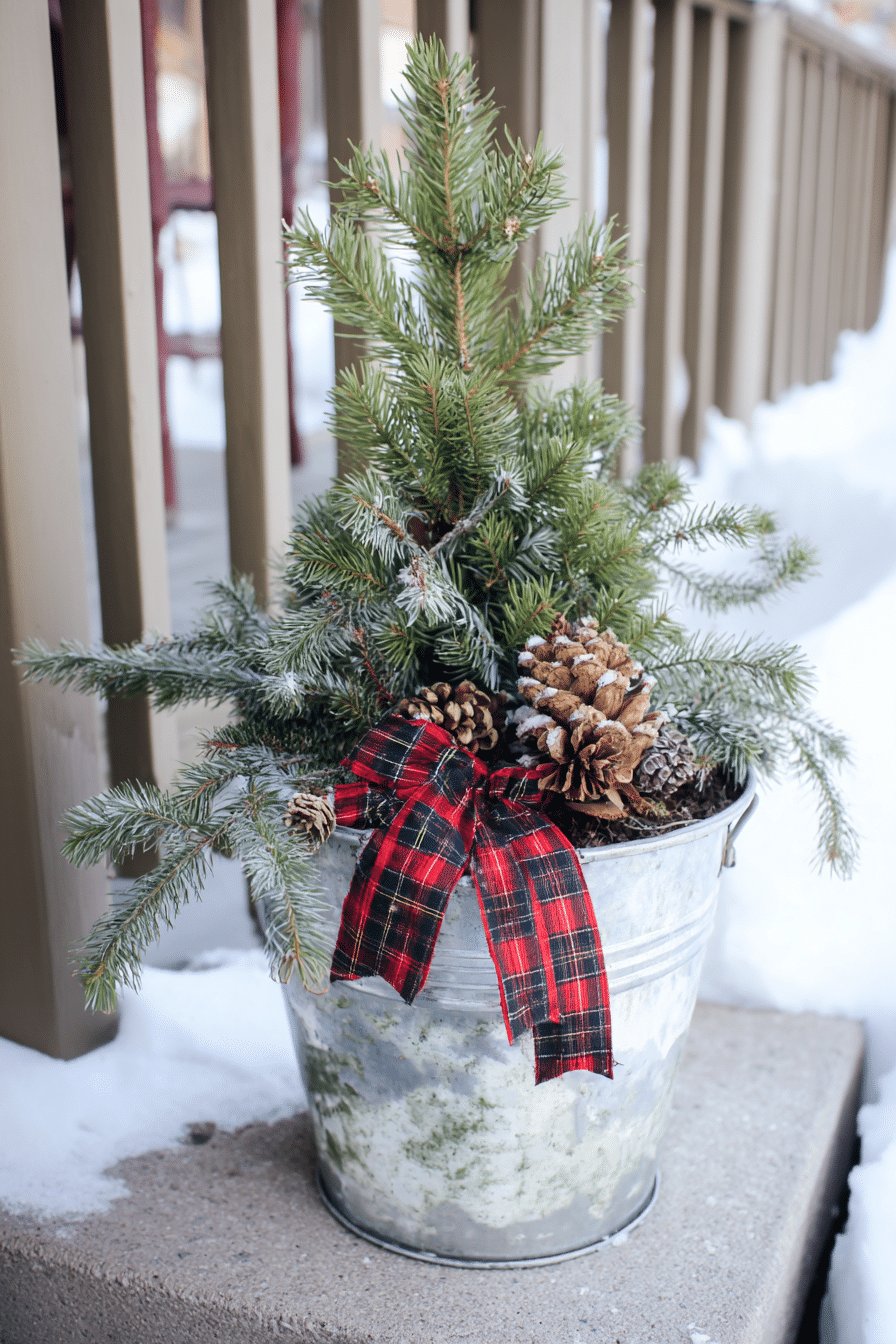 I love the effortless, homespun charm of this Christmas Tree Planter. The petite evergreen stands proud in a weathered galvanized bucket, its boughs tipped with a dusting of frost and tucked around with frosted pine cones and a frayed red plaid ribbon.