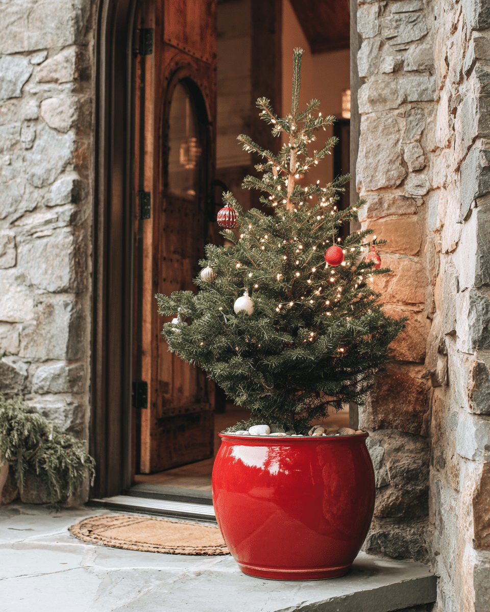Style it with a weathered doormat, a lantern or two with battery candles, and a scatter of pinecones or brass bells at the base for texture. Keep the surroundings neutral—stone, wood, and woven accents—so the red pot really pops.