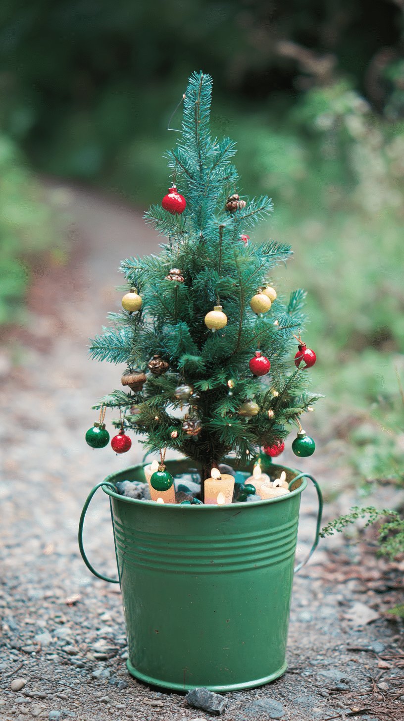 I love how this little Christmas Tree Planter looks like holiday cheer in a bucket. The compact evergreen sits snug in a green metal tub, dressed with tiny red, yellow, and green baubles, a handful of pine cones, and a soft thread of warm lights.