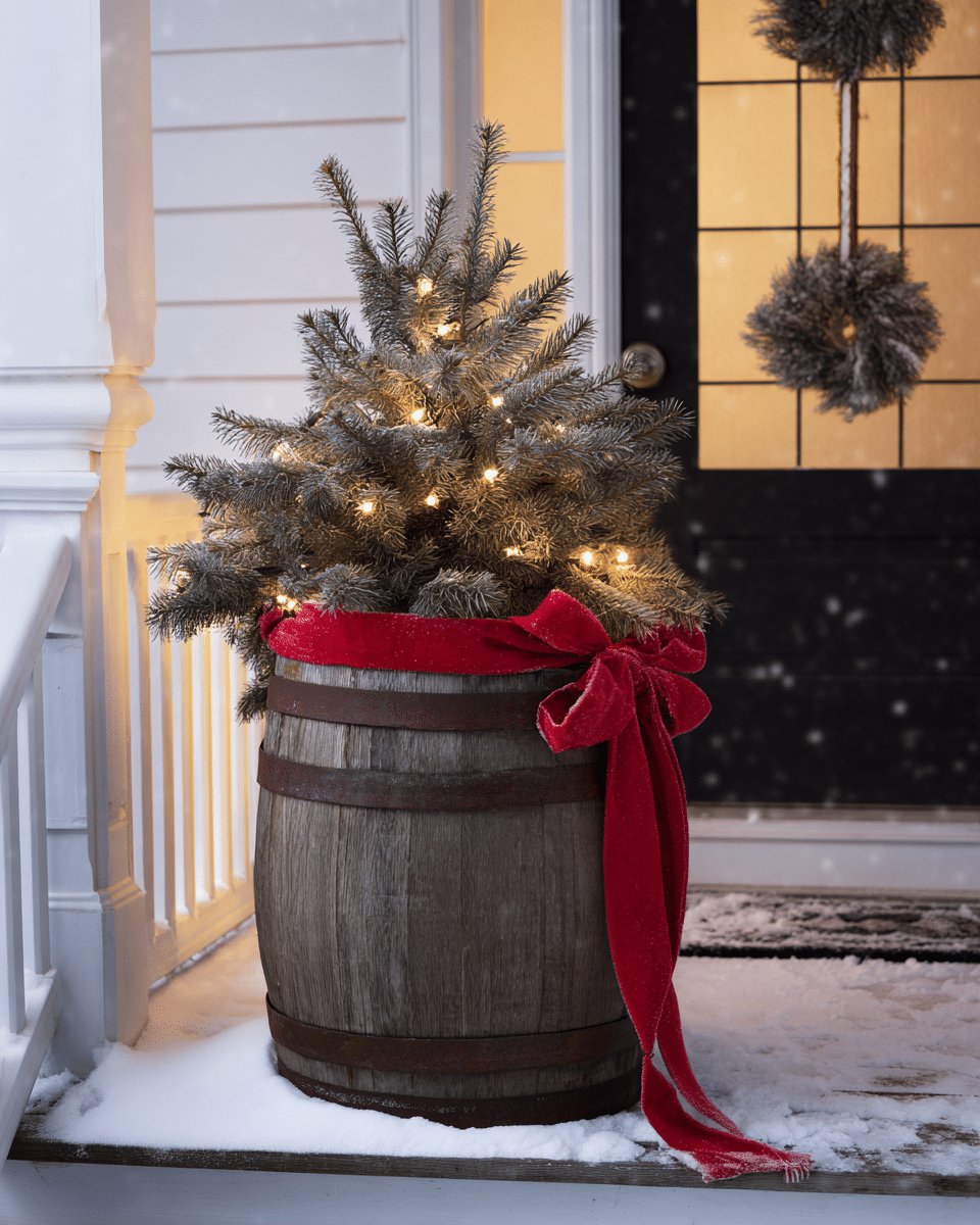 I love how this little evergreen reads like holiday cheer on vacation. The compact fir sits snug in a weathered wooden barrel with rusty hoops, dusted in snow and wrapped in warm white fairy lights.