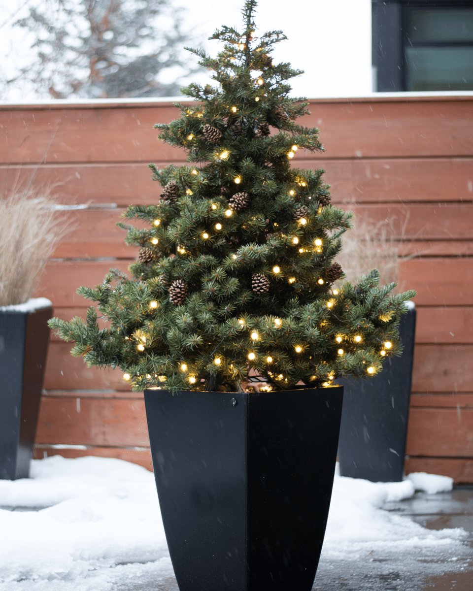 The scale feels perfect for a porch or balcony, and the clean planter keeps the look modern so the tree does the holiday talking without going overboard.