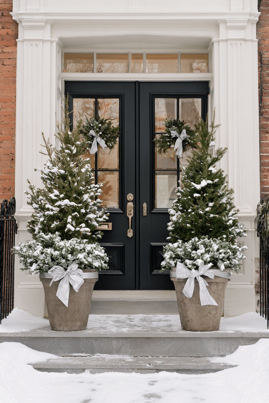 Generous silver bows and matching wreaths on the door keep the palette crisp and wintry, while the black doors and brass hardware give the whole setup a little city-house polish. It reads festive without being fussy.