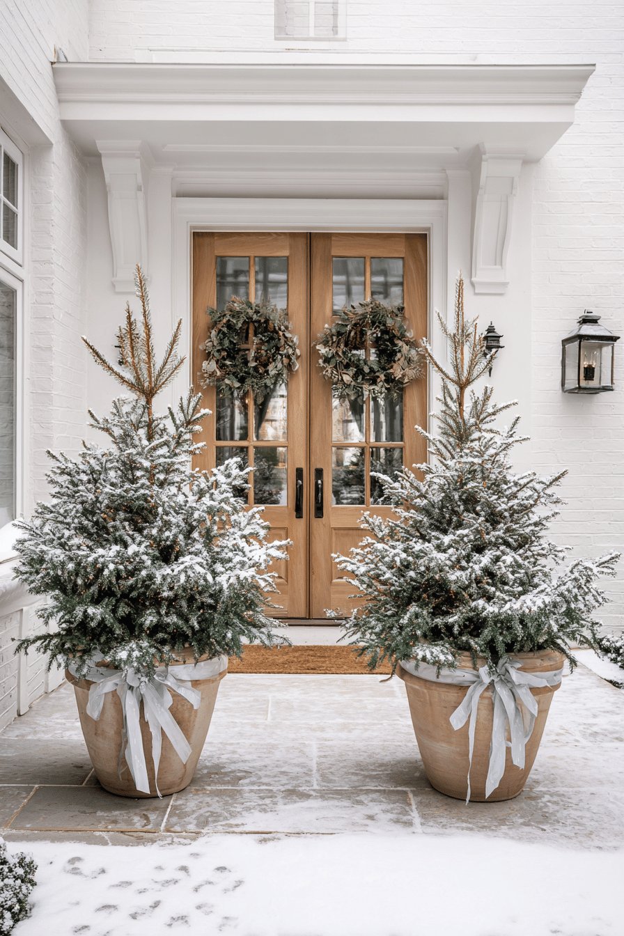I love how these potted Christmas trees read chic and effortless. Snow-dusted evergreens spill over warm terracotta pots tied with soft gray ribbons, while taller tip branches give a little height and personality.