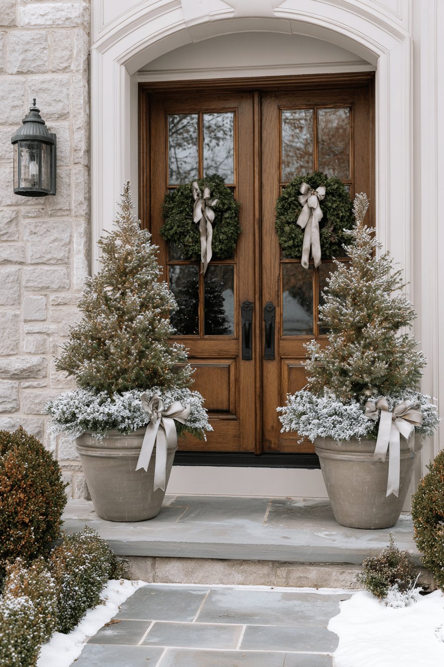 Big silk ribbons tie the look to the matching wreaths on the door, so everything feels pulled together, symmetrical, and just a touch elegant.