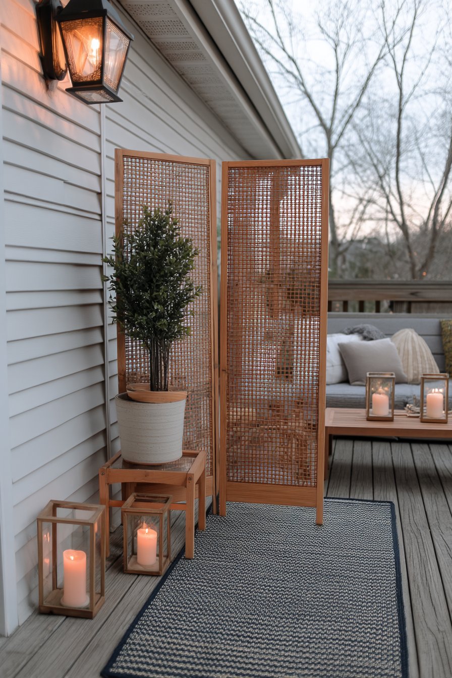 The combination of a modern wooden privacy screen and soft lantern lighting creates an inviting, serene atmosphere perfect for relaxation. Incorporate low-maintenance plants like boxwoods in stylish pots and use warm, ambient lighting to enhance the cozy feel.