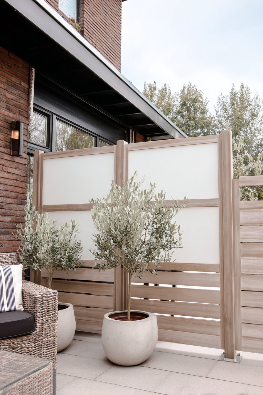 The elegant combination of sleek wooden screens and potted olive trees creates a serene outdoor retreat perfect for privacy. To replicate this look, use minimalist planters and choose low-maintenance plants like olives that thrive in various conditions.