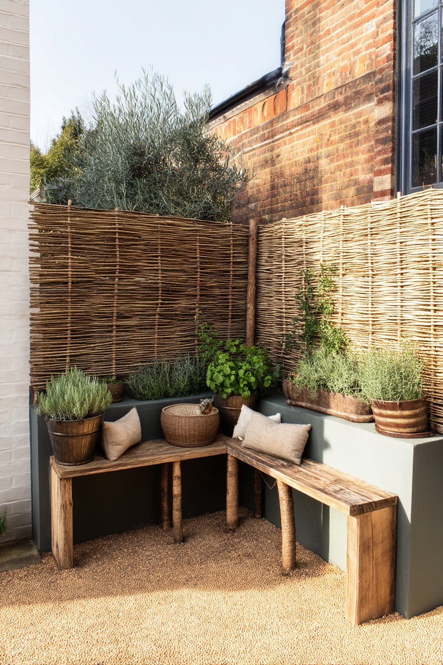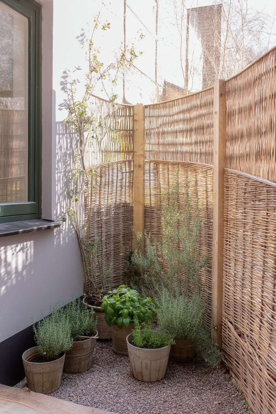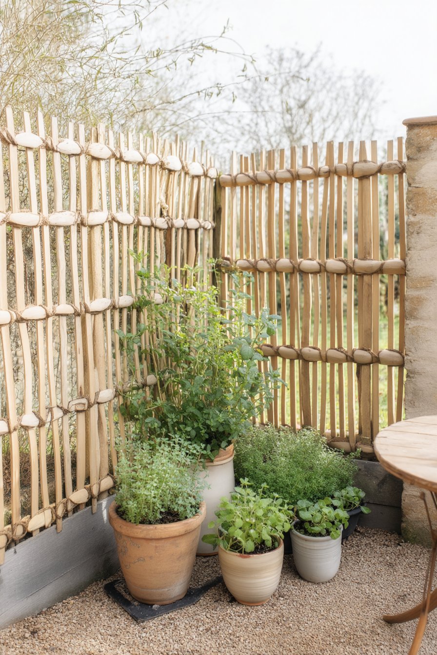 The rustic woven screen beautifully complements the lush green of basil, thyme, and other herbs, creating a serene and inviting nook. To replicate this look, use terracotta pots and a natural screen to enhance texture and warmth.