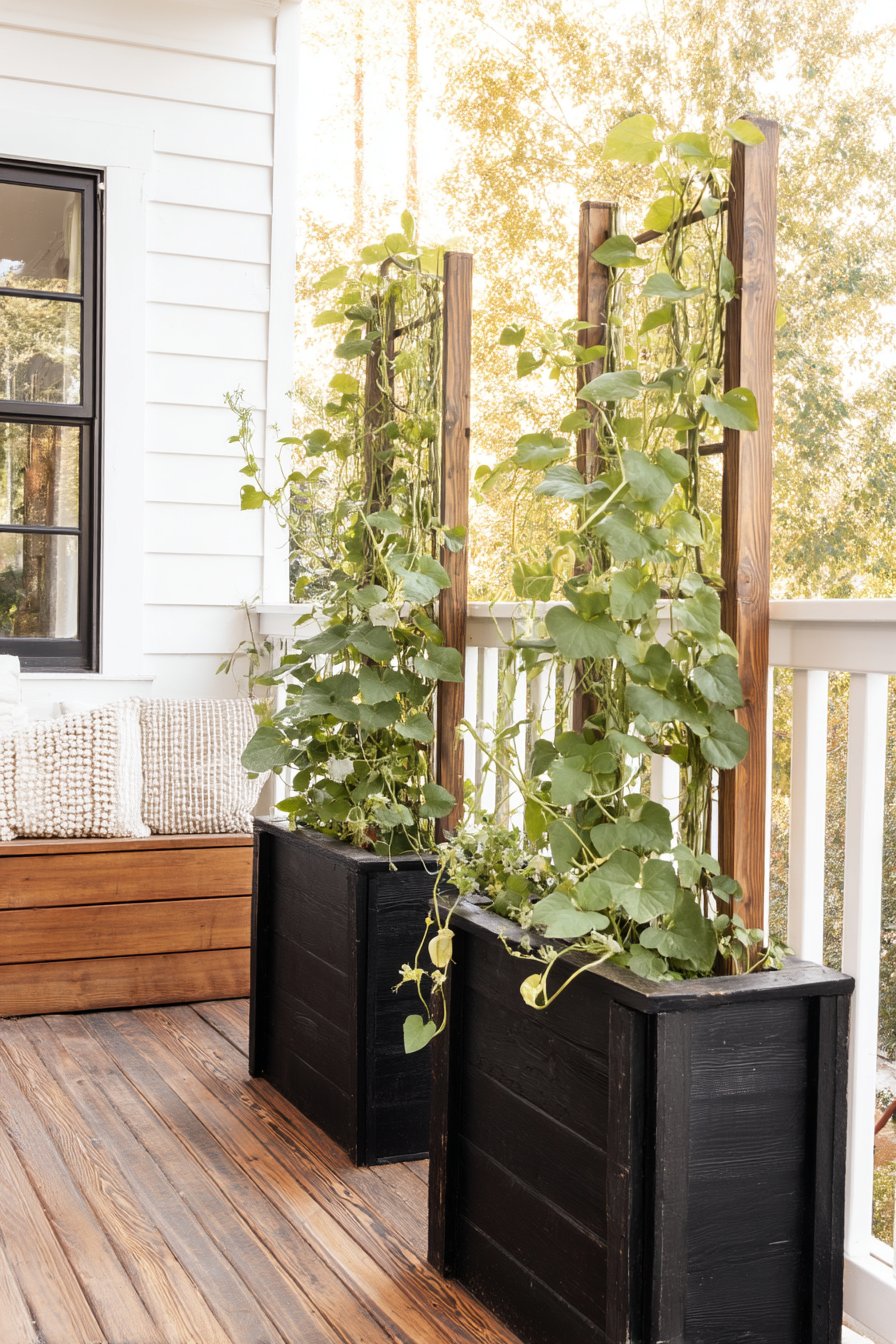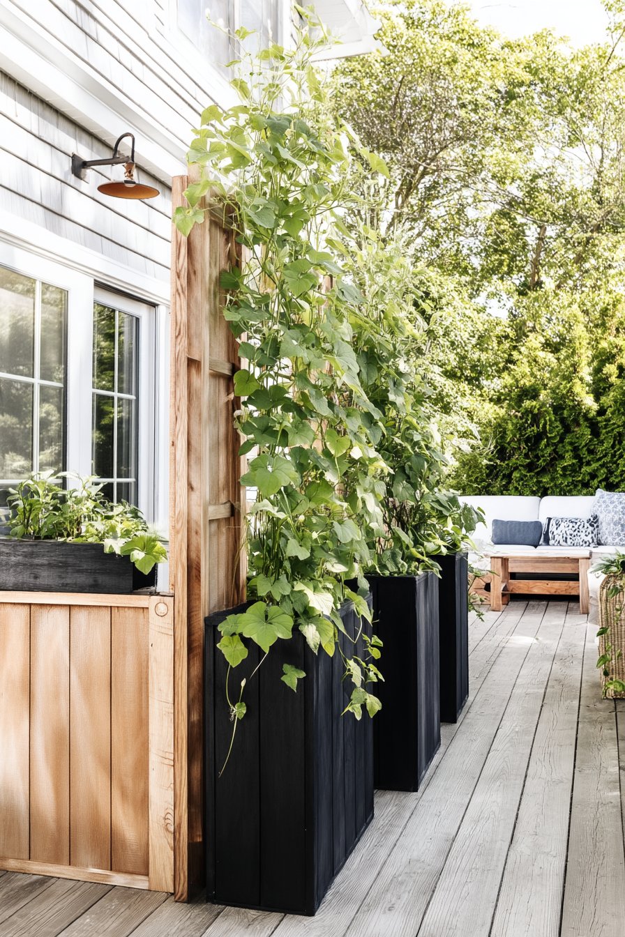 The sleek black and natural wood planters create a striking contrast, while climbing plants like sweet peas add lush vertical interest. For a similar effect, choose sturdy planters and select vibrant, fast-growing vines to enhance your outdoor space.