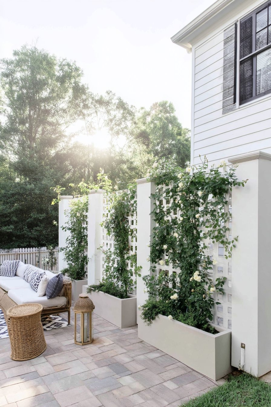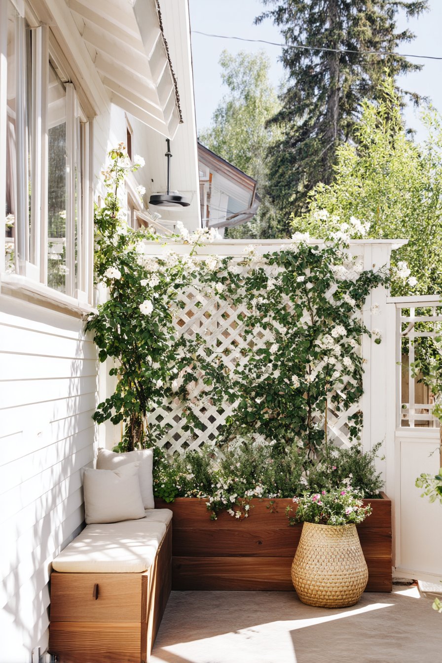 The elegant white roses climbing a chic lattice create a stunning privacy screen, enhancing the serene ambiance of any outdoor space. To replicate this look, choose robust climbing roses and pair them with stylish planters for added visual appeal.