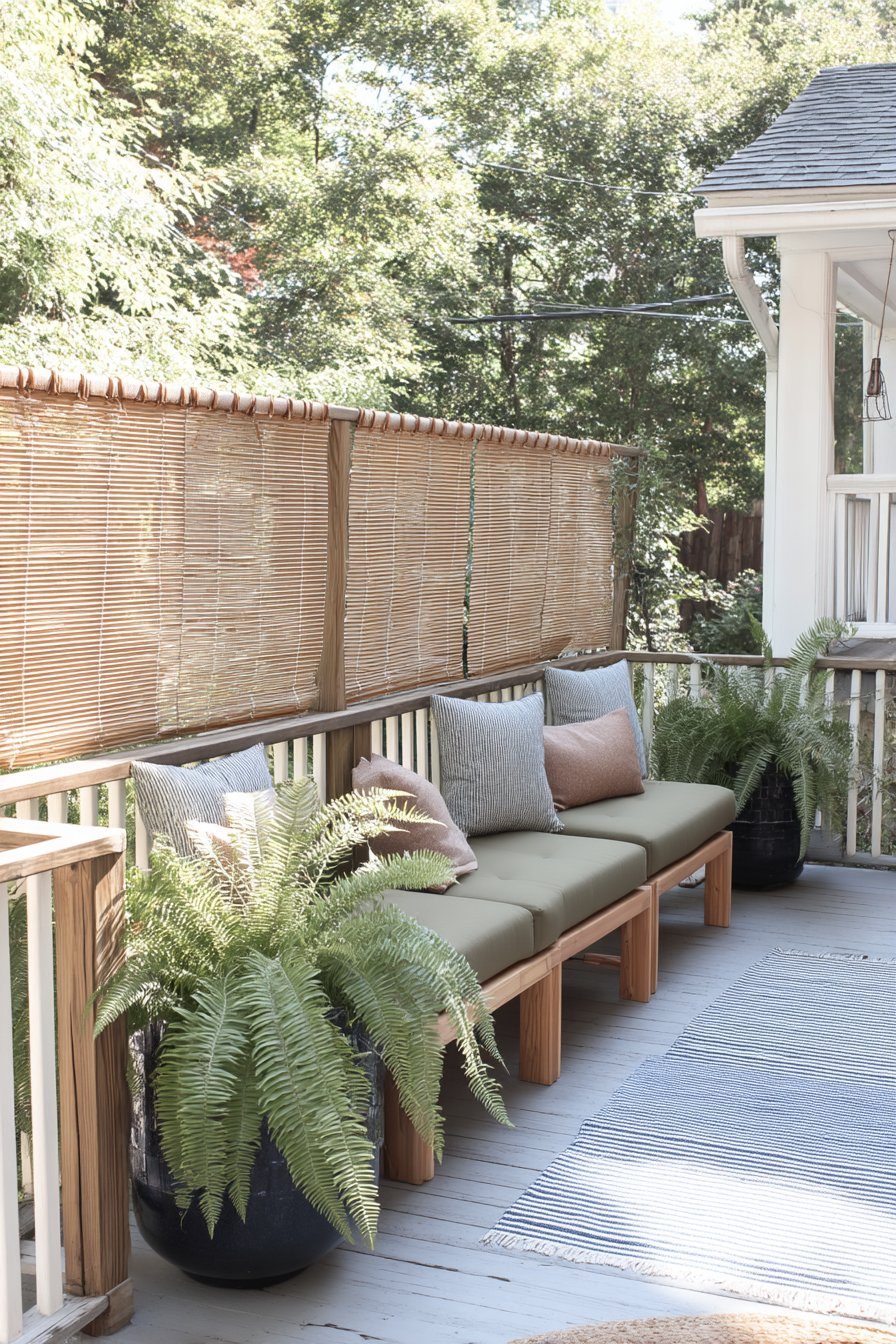 The harmonious blend of bamboo and lush ferns creates a serene privacy screen, perfect for cozy outdoor lounging. To replicate this look, choose tall and vibrant ferns in stylish pots for a calming atmosphere.