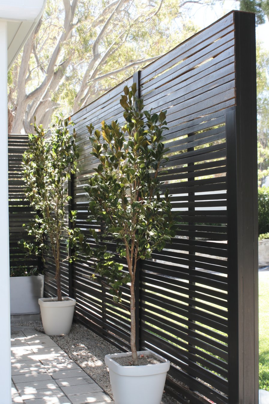 The sleek black wooden privacy screens beautifully contrast with the lush green foliage of potted magnolia trees, creating a serene and modern atmosphere. For a similar look, use minimalist containers and choose evergreen plants for year-round vibrancy and privacy.