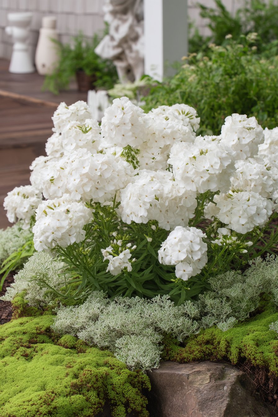 The striking white phlox creates a stunning focal point against a backdrop of lush greenery, providing a serene and elegant atmosphere. To replicate this look, consider combining white flowering plants with various shades of green ground cover for depth and texture.