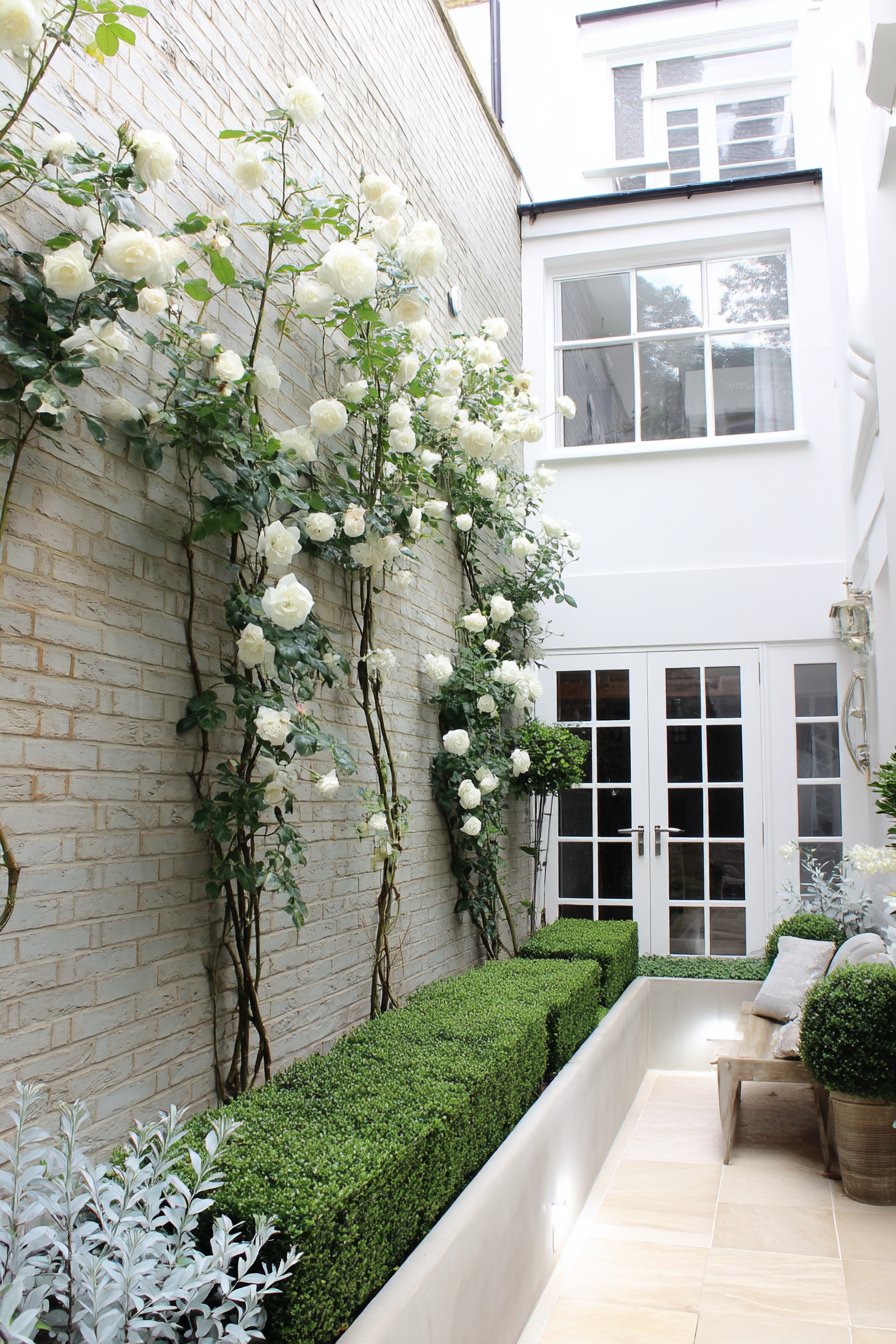 The elegant arrangement of white climbing roses against a textured wall creates a serene and inviting atmosphere, perfect for urban retreats. Incorporating neatly trimmed boxwood hedges alongside soft silver foliage adds depth and contrast, making the space feel lush and well-maintained.