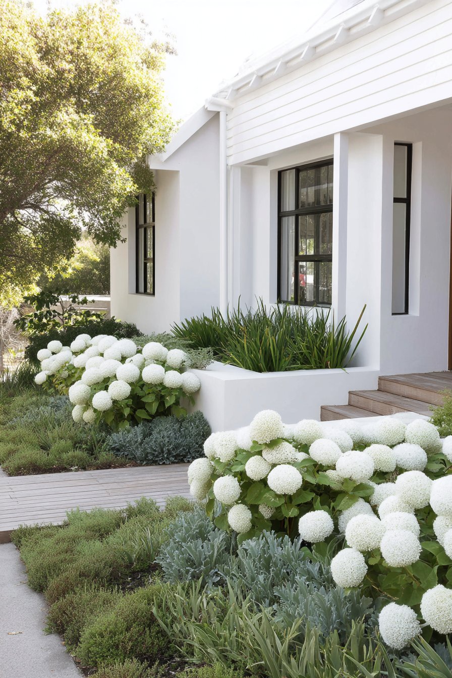 The lush white hydrangeas create a striking contrast against the minimalist architecture, while the soft greens and textured foliage add depth and tranquility. To replicate this serene look, consider grouping large flowering shrubs with low-growing ground covers for a harmonious blend.