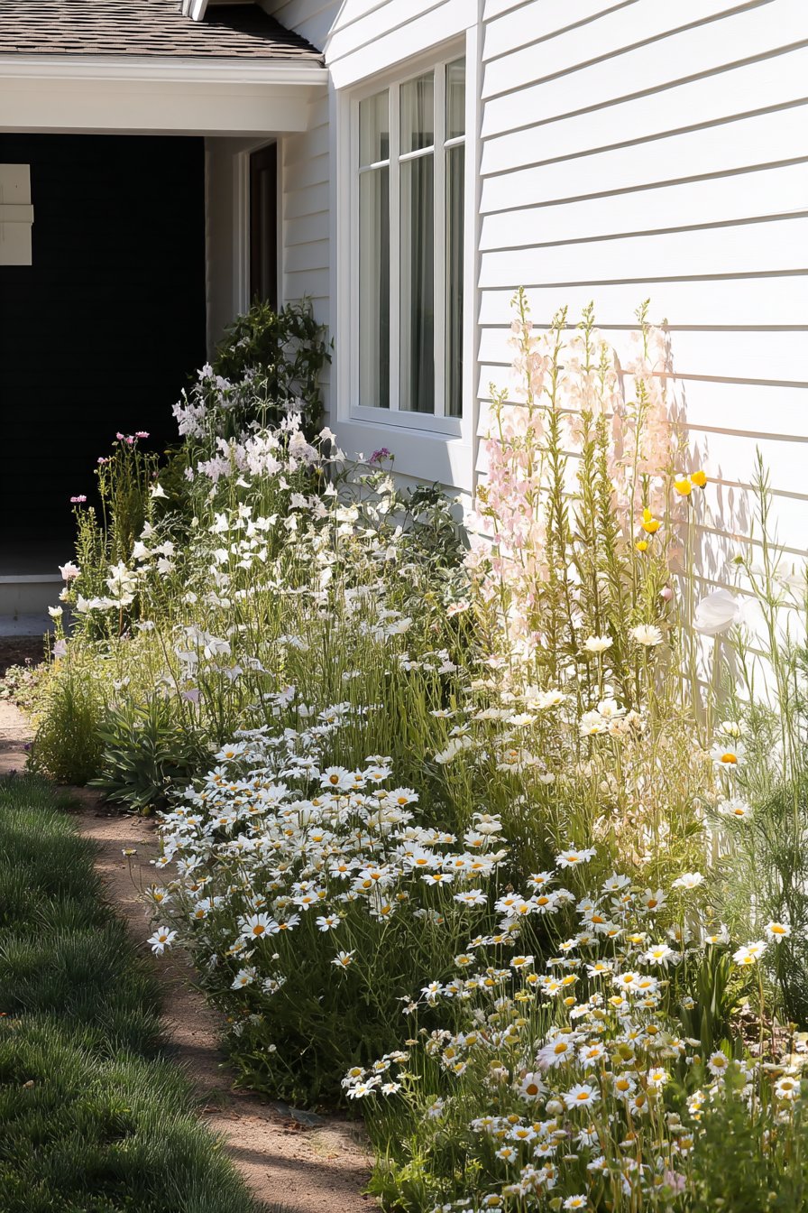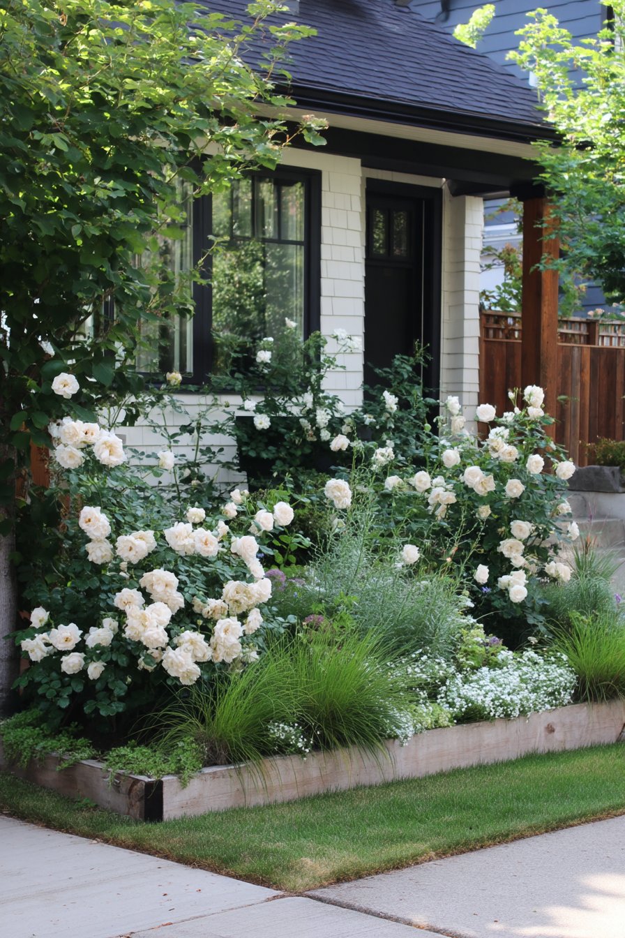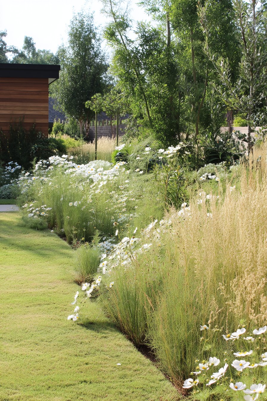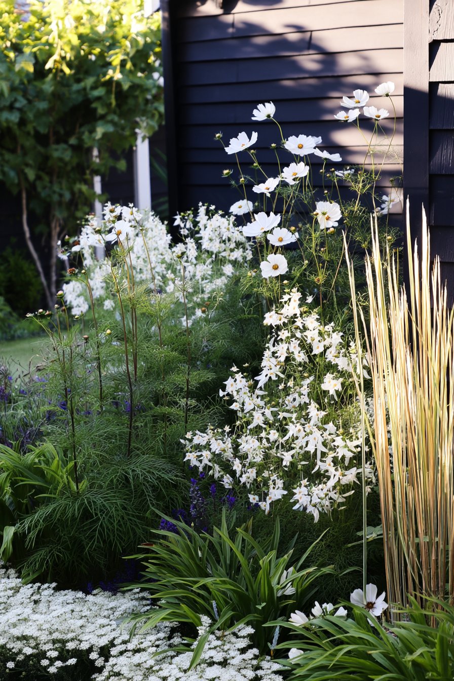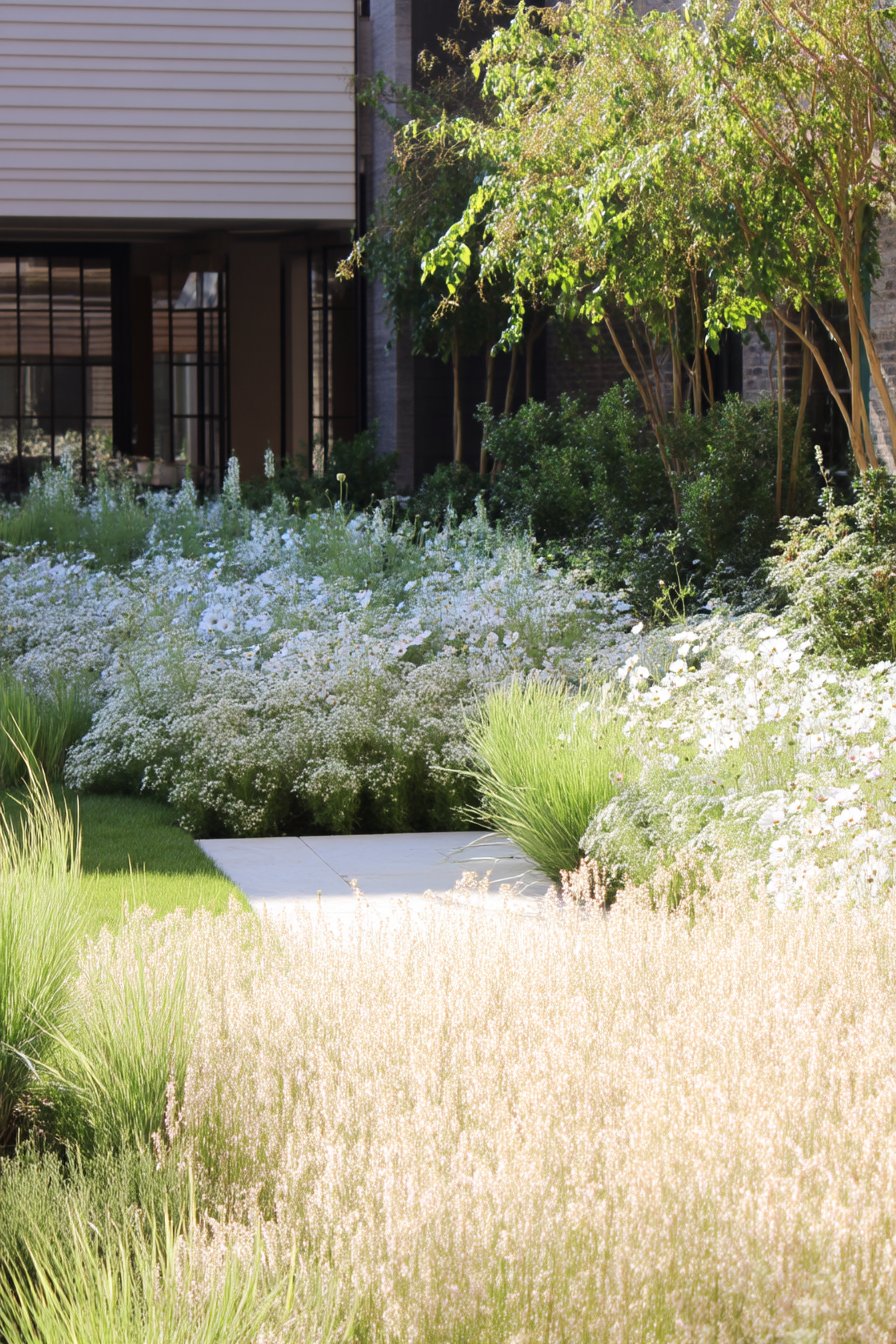 This garden beautifully combines soft white flowers, such as baby’s breath and delicate daisies, with wispy ornamental grasses for a serene atmosphere. To replicate this look, group perennials in clusters and incorporate varying heights for visual interest while ensuring easy maintenance.