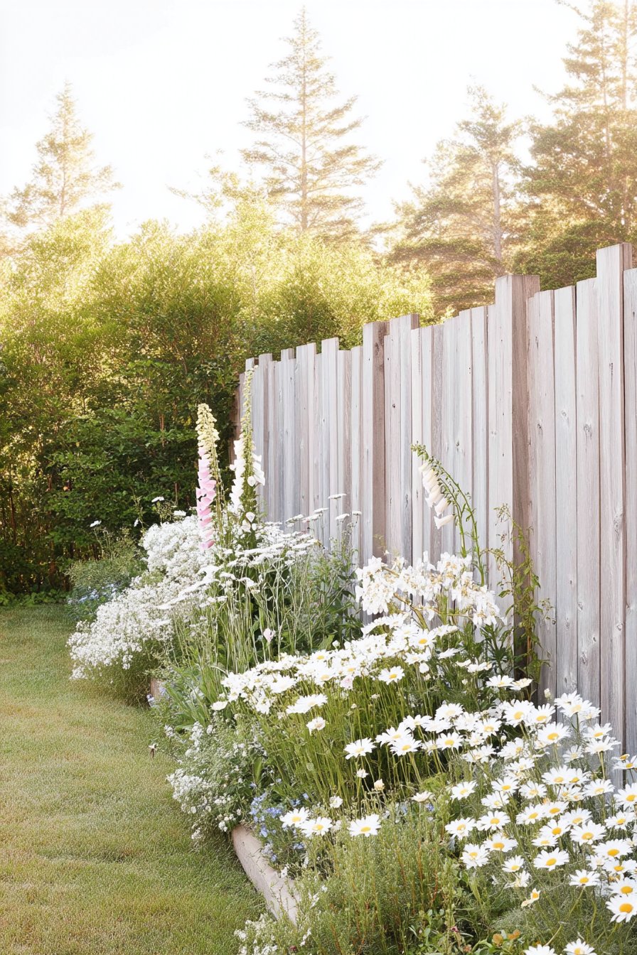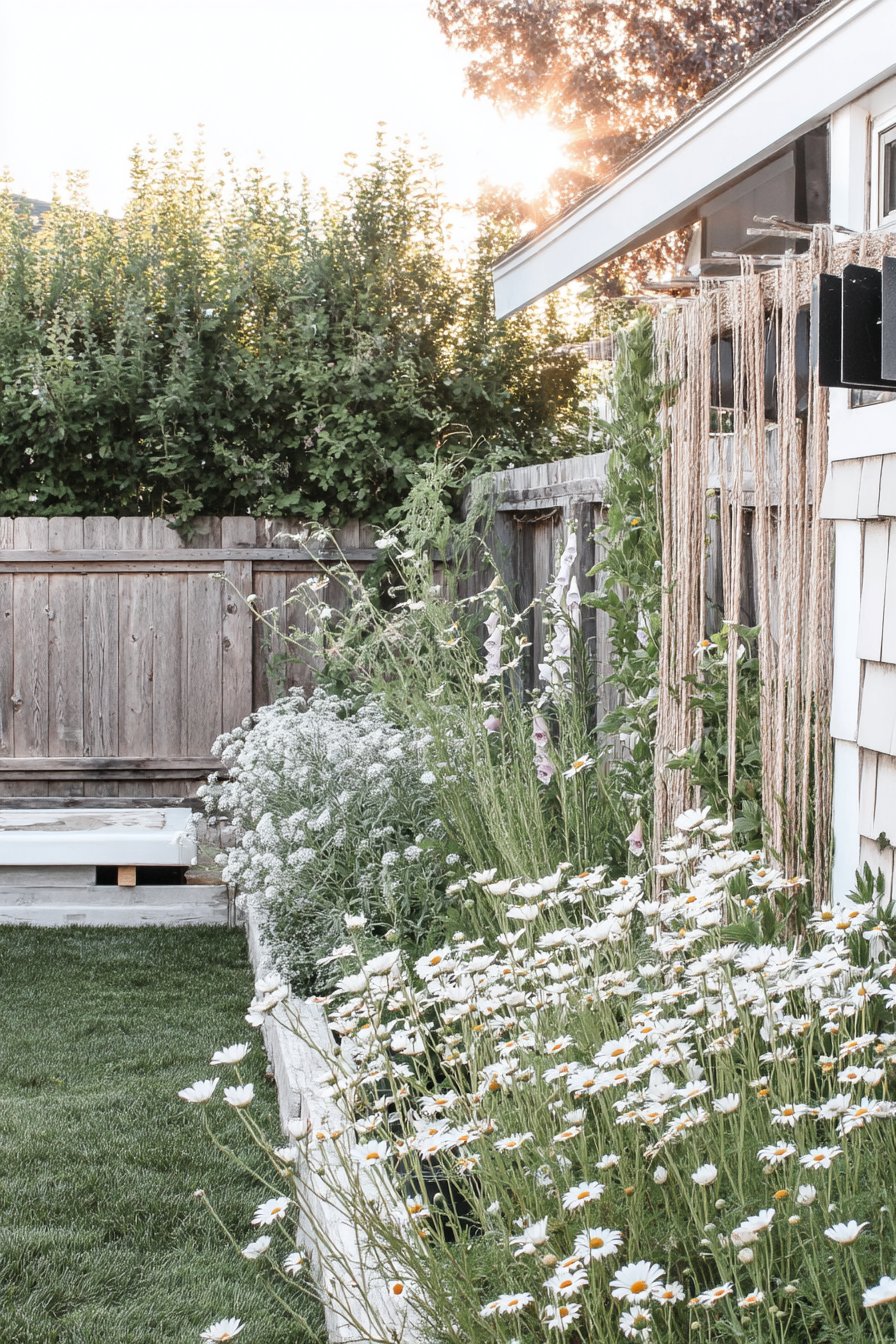 This enchanting garden features a lush border of white daisies and soft pastel blooms, creating a serene atmosphere perfect for relaxation. To replicate this look, incorporate a mix of perennials like foxgloves and cosmos, ensuring varied heights for visual interest.