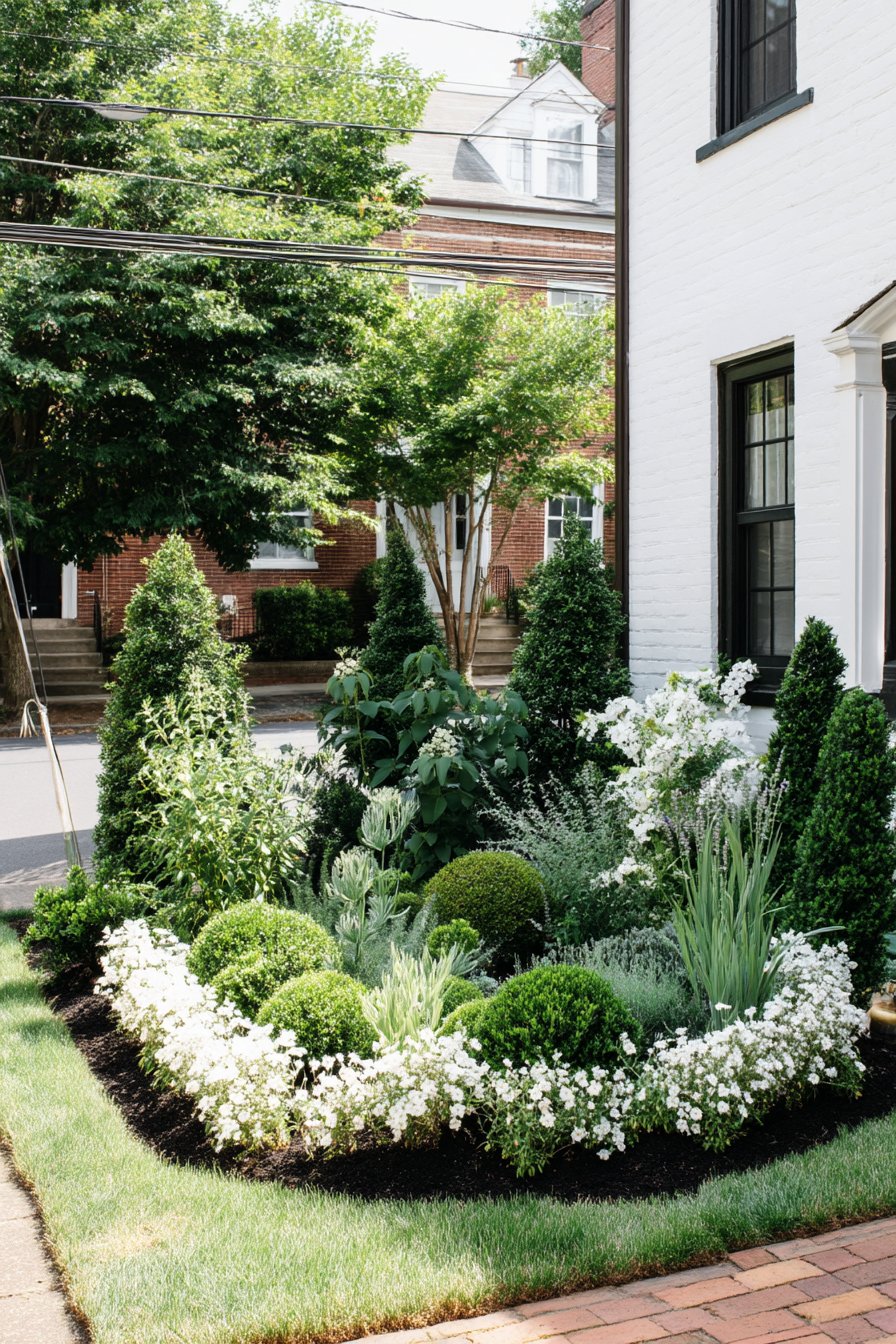 This garden features a stunning contrast of lush green boxwoods and delicate white annuals, creating a serene and inviting atmosphere. To replicate this look, choose low-maintenance plants like petunias and incorporate rounded topiary for added structure and elegance.