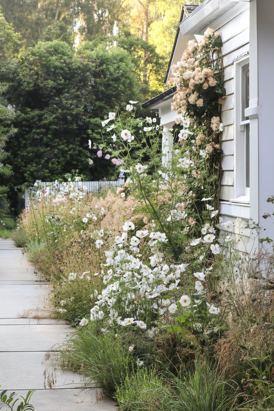 This enchanting garden features a harmonious blend of white flowers like anemones and delicate grasses, creating a serene and inviting atmosphere. To replicate this look, consider planting perennials alongside ornamental grasses for a soft, natural border that flourishes throughout the seasons.
