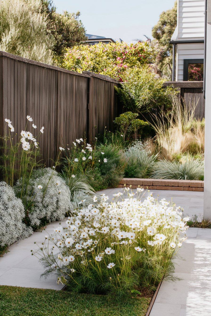 This beautifully showcases vibrant white cosmos flowers paired with soft, silvery foliage, creating a tranquil atmosphere. To replicate this serene look, incorporate low-maintenance plants and use clean stone pathways for a modern touch.