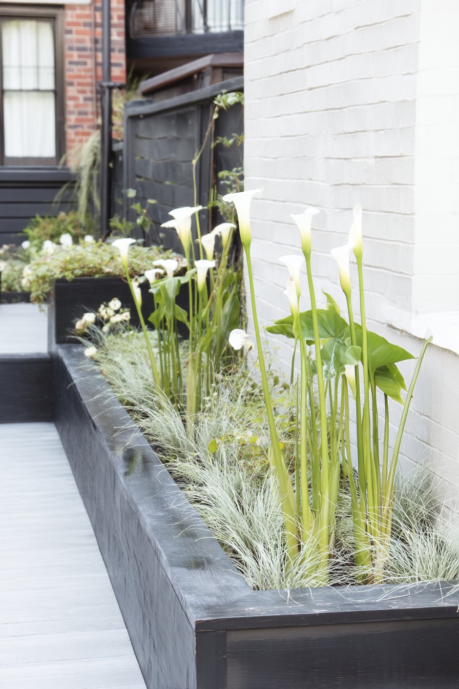 This design beautifully showcases elegant white calla lilies paired with soft, airy grasses, creating a serene and sophisticated atmosphere. To replicate this look, choose tall, striking flowers and surround them with low-maintenance ground cover for contrast and texture.