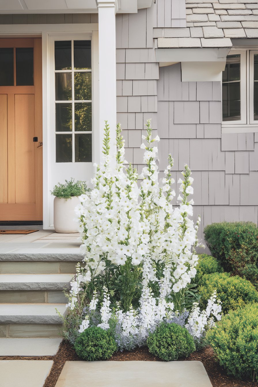 The striking white delphiniums create a stunning focal point at the entryway, beautifully complemented by soft lavender and lush boxwood. For a similar look, consider mixing tall white blooms with low greenery, ensuring varied heights for visual interest.