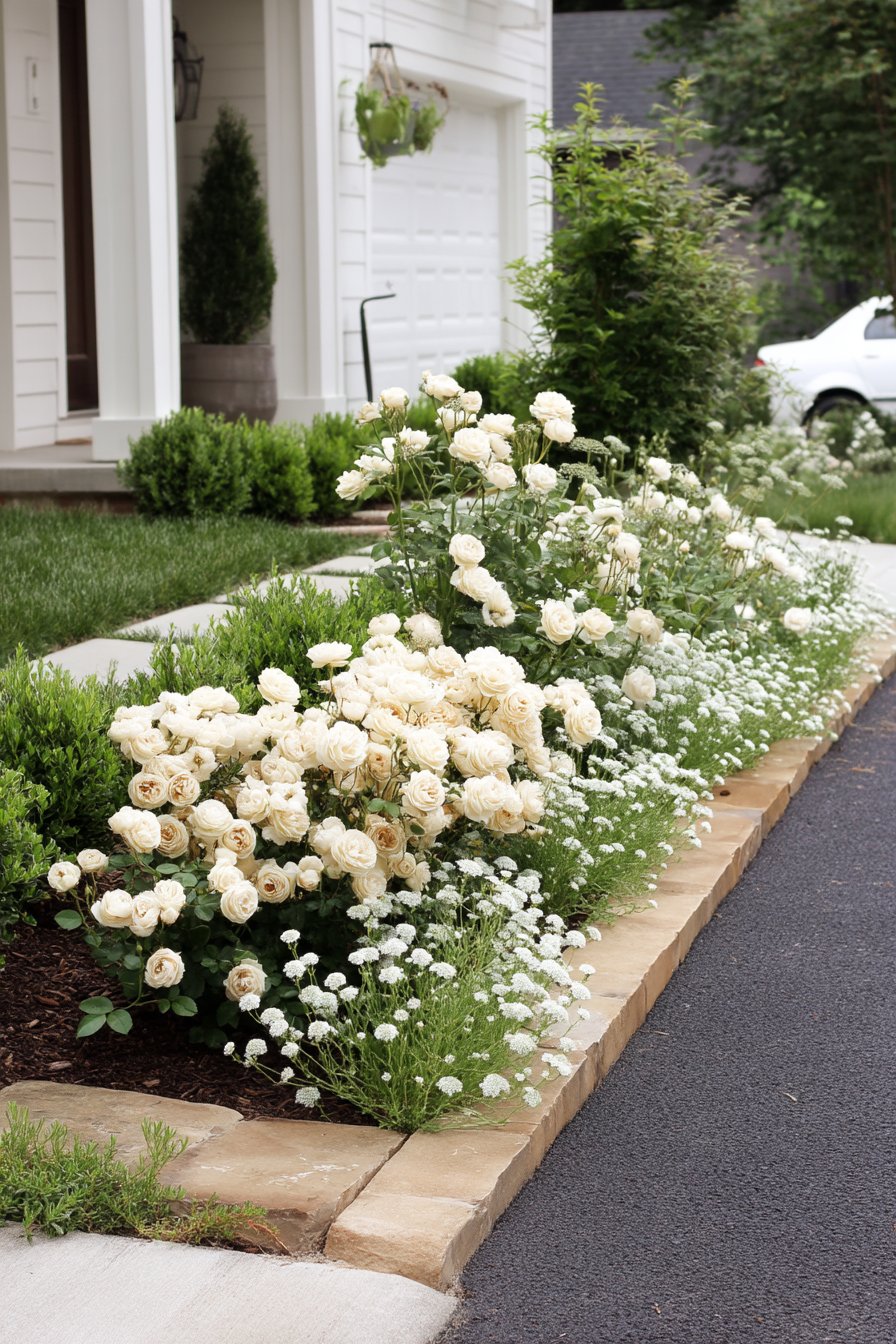 The harmonious blend of soft white roses and lush greenery creates a tranquil atmosphere, perfect for inviting serenity into any garden space. Incorporate low-maintenance groundcovers like baby’s breath and ornamental grasses to enhance visual interest and provide a seamless transition between plants.