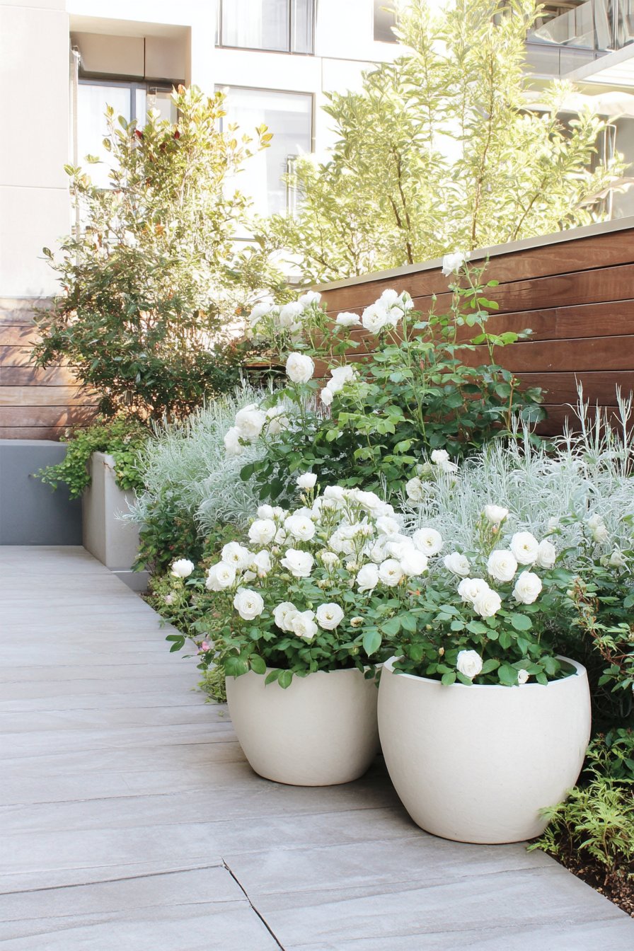 The soft white roses create a stunning focal point, beautifully complemented by lush greenery and silvery foliage for texture. For a similar effect, choose sturdy containers and mix flowering plants with contrasting leaf colors to enhance visual interest.