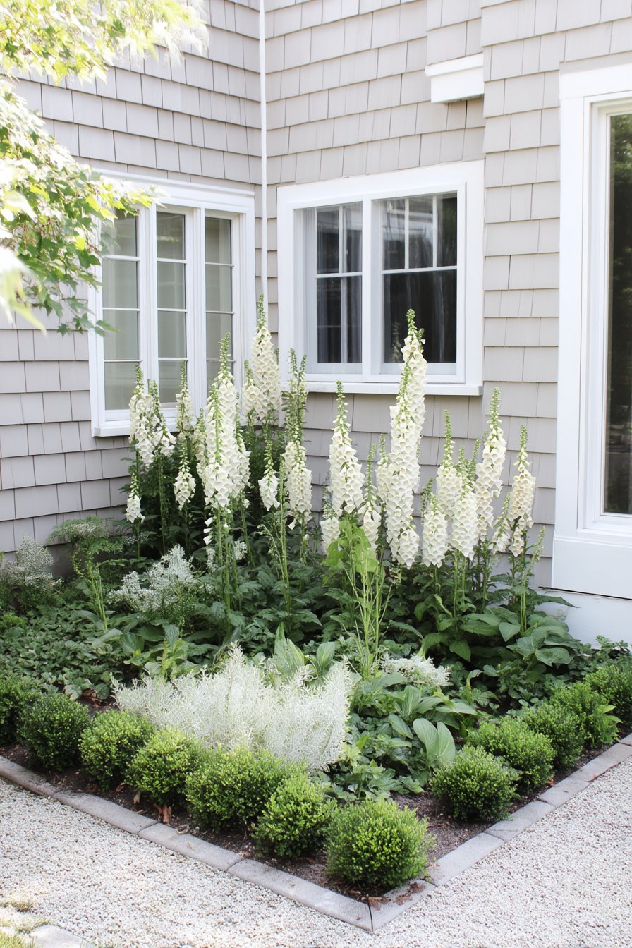 Tall, elegant white foxgloves create a striking focal point, beautifully complemented by lush greenery and soft textures from ornamental plants. To achieve a similar serene look, use a mix of perennials and low-maintenance boxwood hedges for structure and visual interest.