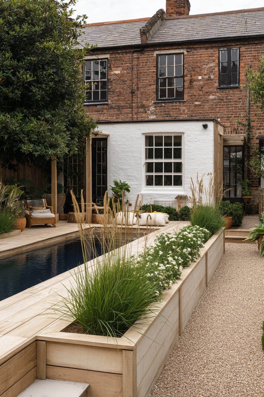 The sleek wooden deck elegantly frames a tranquil pool, complemented by soft grasses and vibrant that add texture and contrast. To replicate this serene atmosphere, choose low-maintenance plants like ornamental grasses and perennial groundcovers for a minimalist yet inviting space.