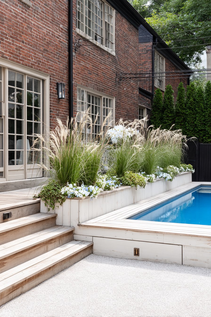 The combination of soft blue petunias and graceful ornamental grasses creates a serene, inviting atmosphere around the pool area. To replicate this look, use raised planters to define space and select low-maintenance flowering plants for vibrant color.