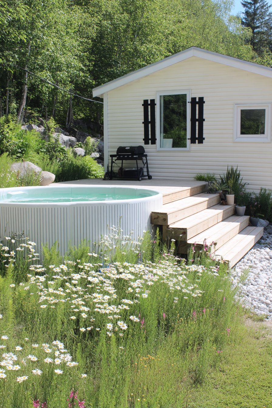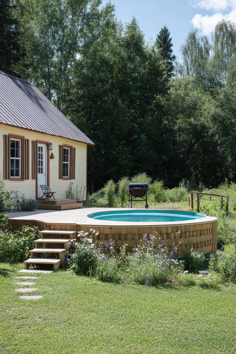 The design features a charming, rustic above-ground pool surrounded by lush native plants, including lavender and wildflowers, creating a serene oasis. To achieve a similar look, incorporate natural materials like wood and select low-maintenance plants that thrive in your local climate.