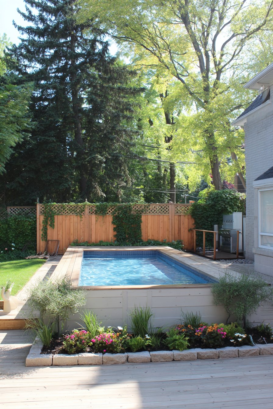 The rustic wooden deck surrounding the inviting pool creates a warm, cozy atmosphere, complemented by lush evergreens and vibrant flowering plants for added color. To achieve a similar look, incorporate a mix of hardy shrubs like arborvitae and seasonal blooms in decorative pots, ensuring a blend of structure and softness.