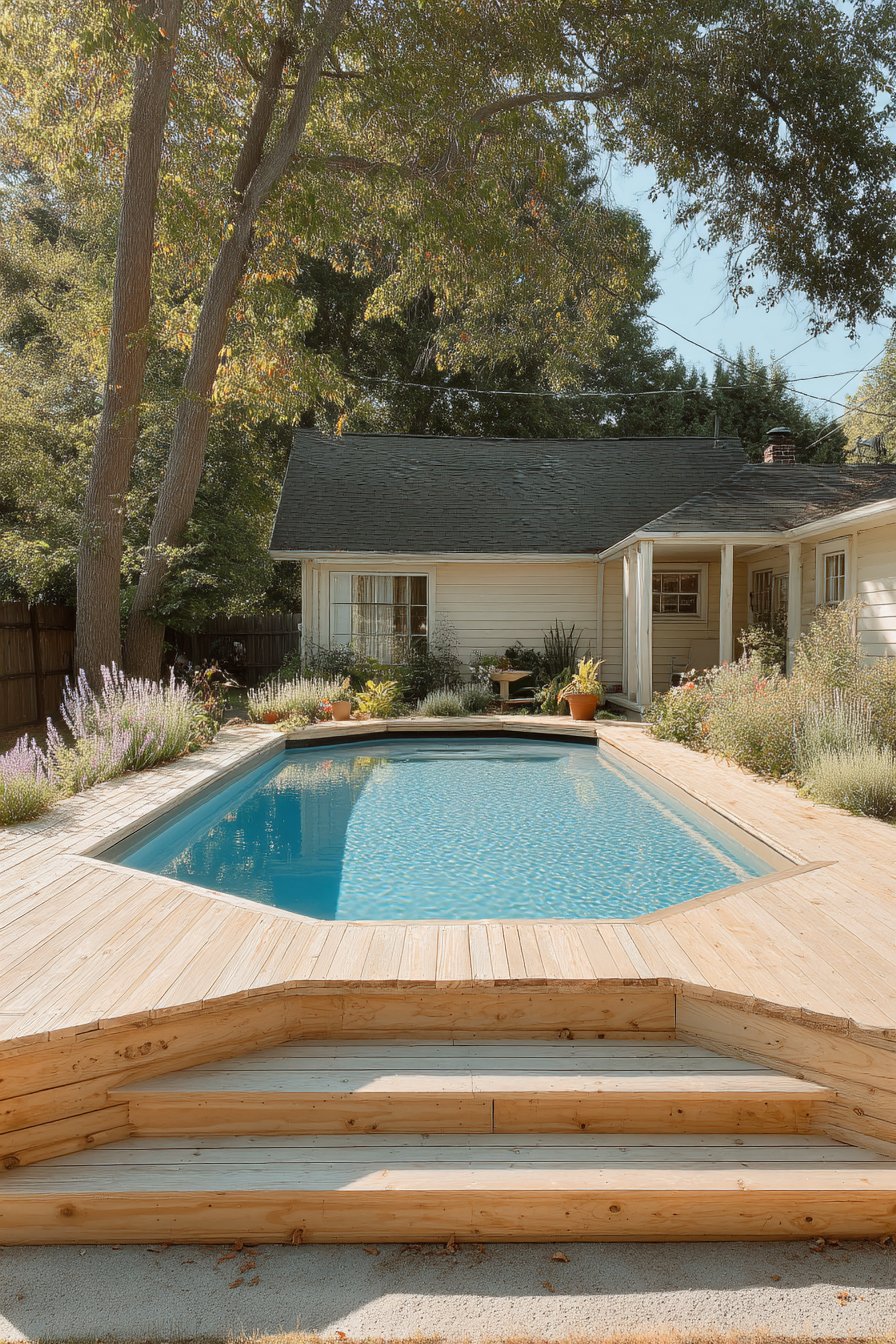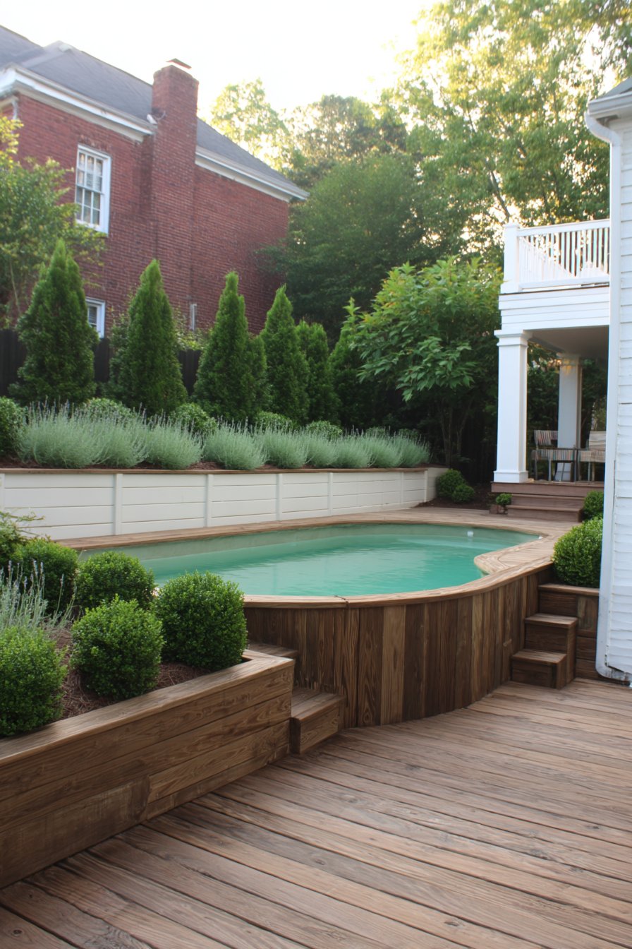 Create a serene retreat by incorporating lush lavender and neatly trimmed boxwoods, which complement the warm wooden decking and enhance the rustic elegance. To achieve this look, consider using low-maintenance plants and wooden planters to frame your pool area beautifully.