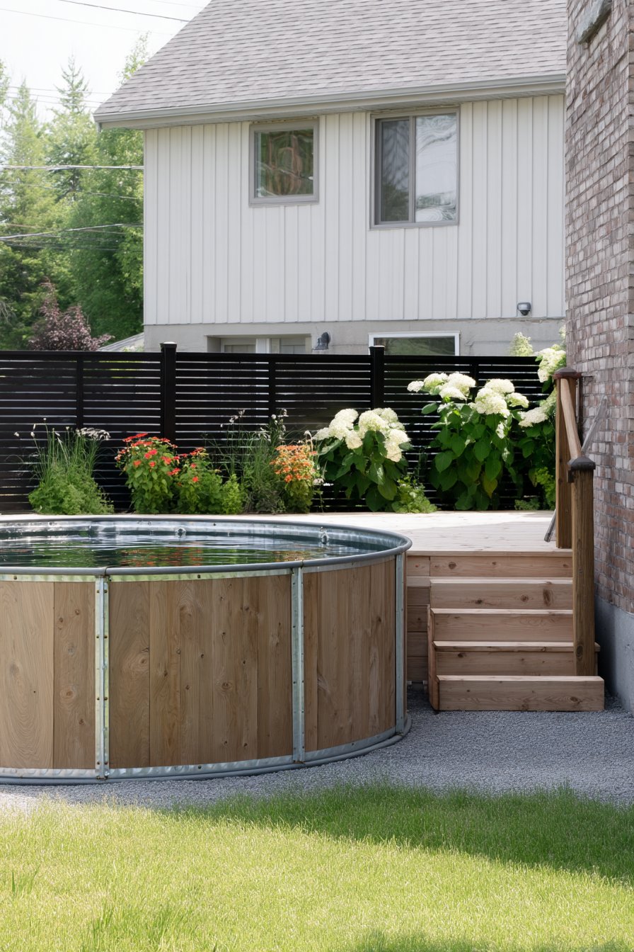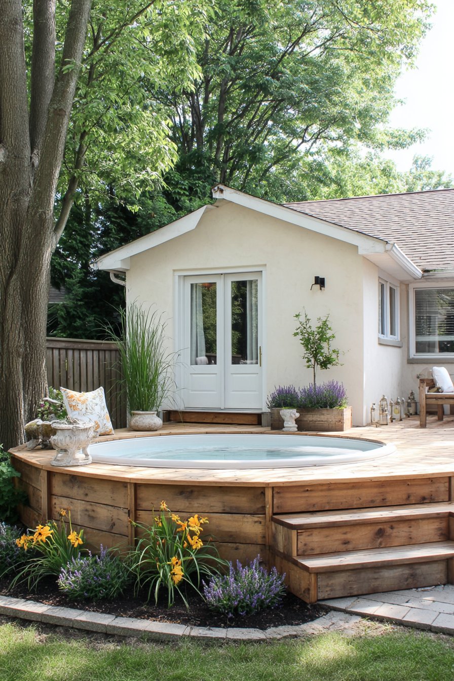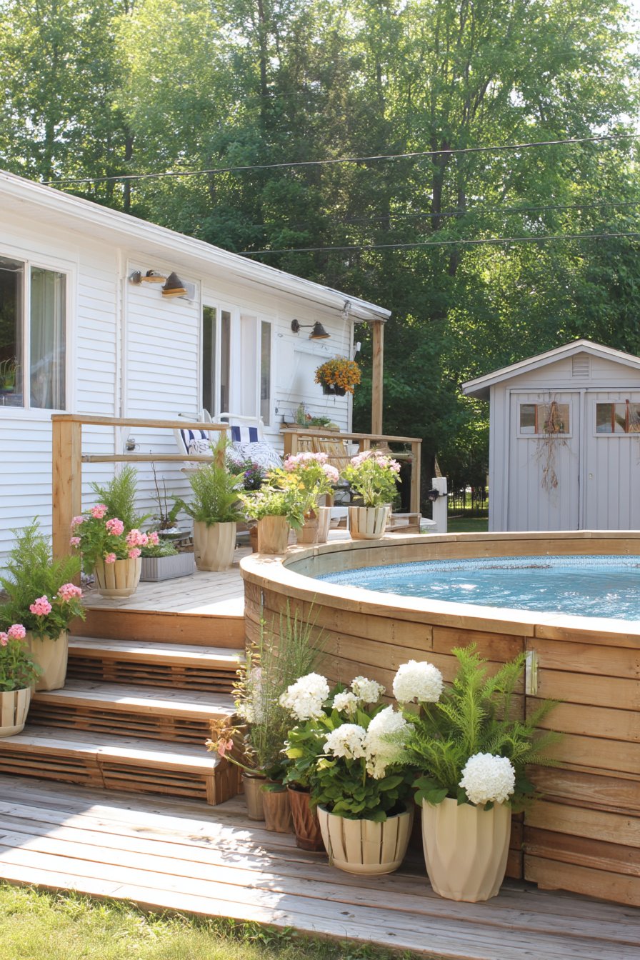 19) Cozy Hydrangea-Framed Above Ground Pool Deck