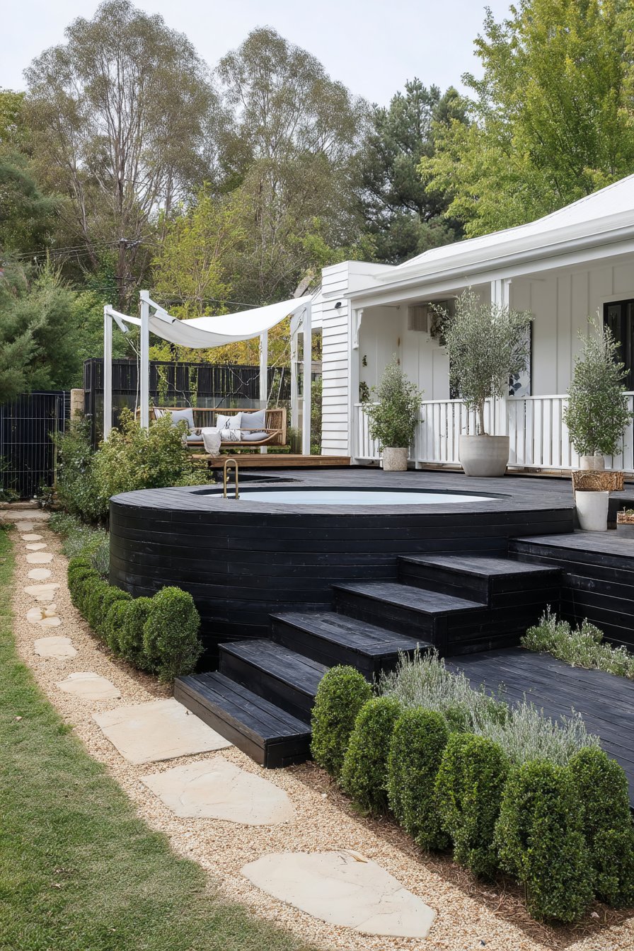 The sleek black wood deck contrasts beautifully with lush greenery, featuring elegant boxwood hedges and aromatic lavender for texture and fragrance. Incorporate a simple stone pathway and a shaded seating area to create a tranquil oasis in your own backyard.