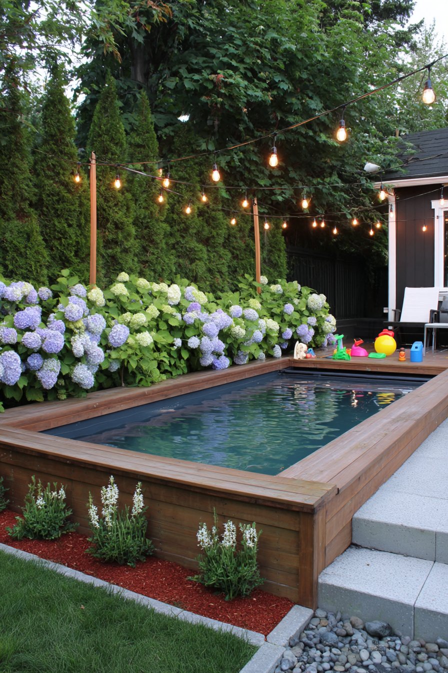 The lush hydrangeas in shades of blue and green create a serene backdrop for the inviting wooden pool deck, enhancing the overall tranquility. To replicate this look, consider planting hydrangeas alongside low-maintenance perennials and adding string lights for a cozy evening ambiance.